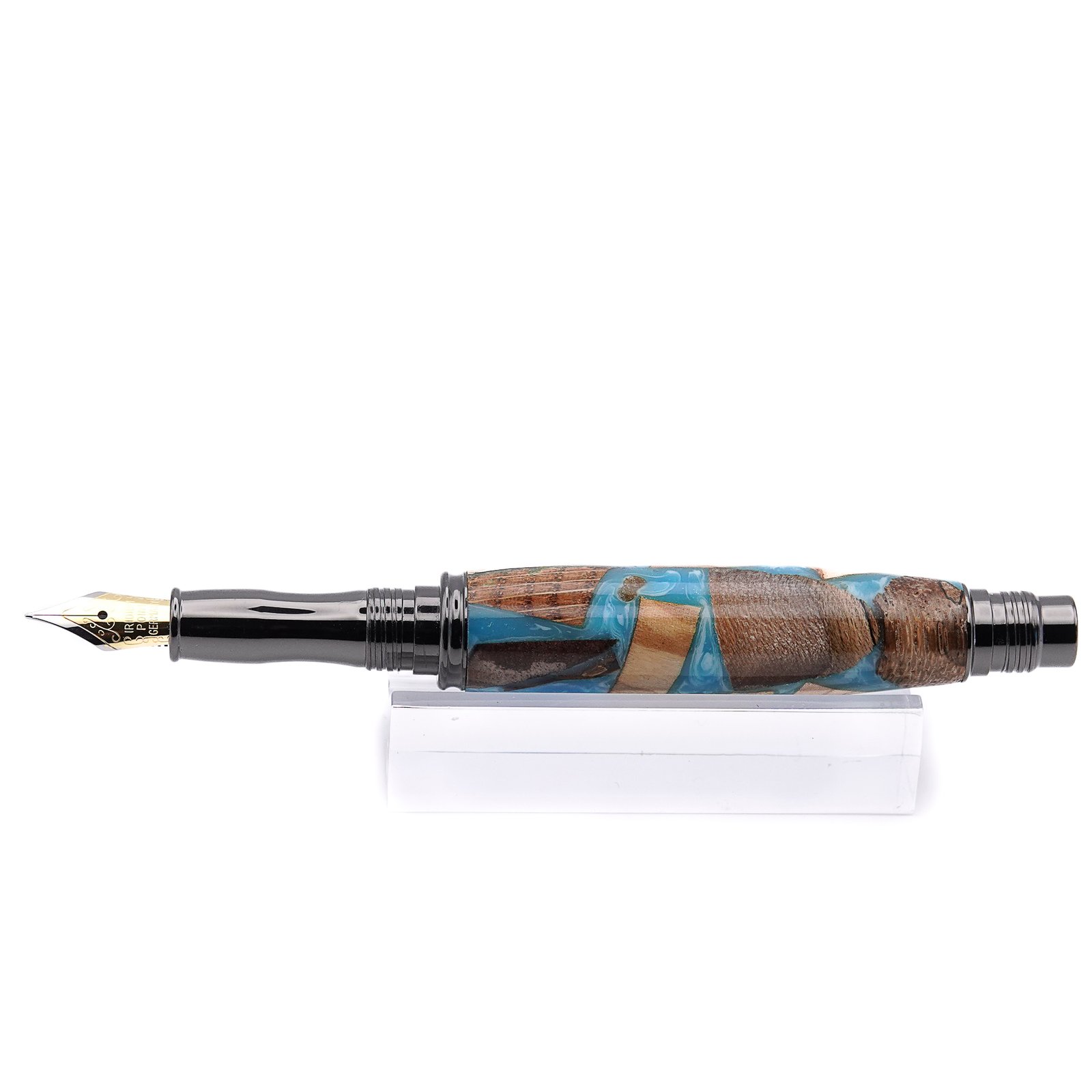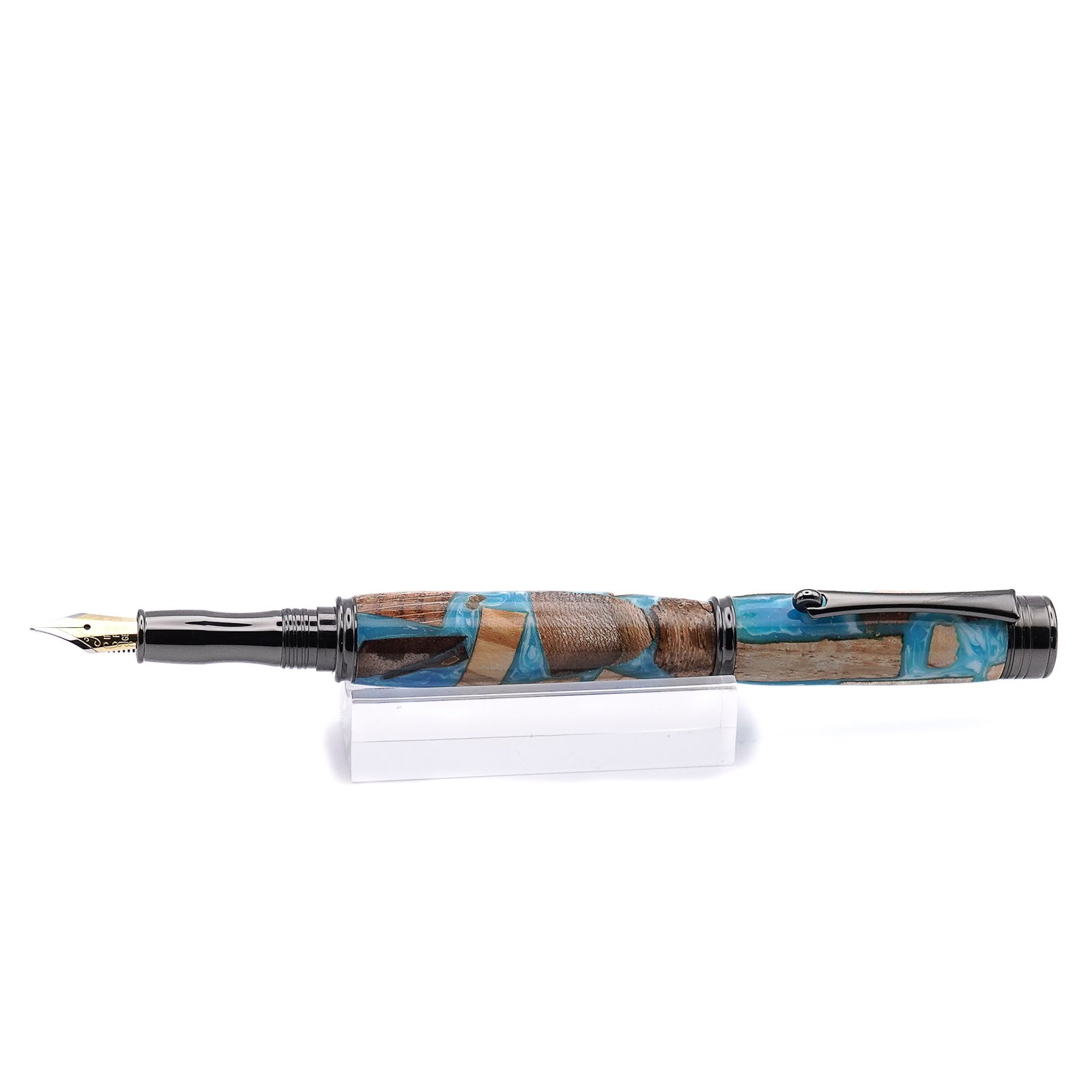 A great addition to the “Driftwood Collection”.  This lovely Fountain Pen is NOT made from driftwood but has been constructed from wood offcuts in blue and white resin with Gun Metal Fittings to give the effect of wood floating in the sea. Each pen is unique, nicely balanced and a pleasure to use.