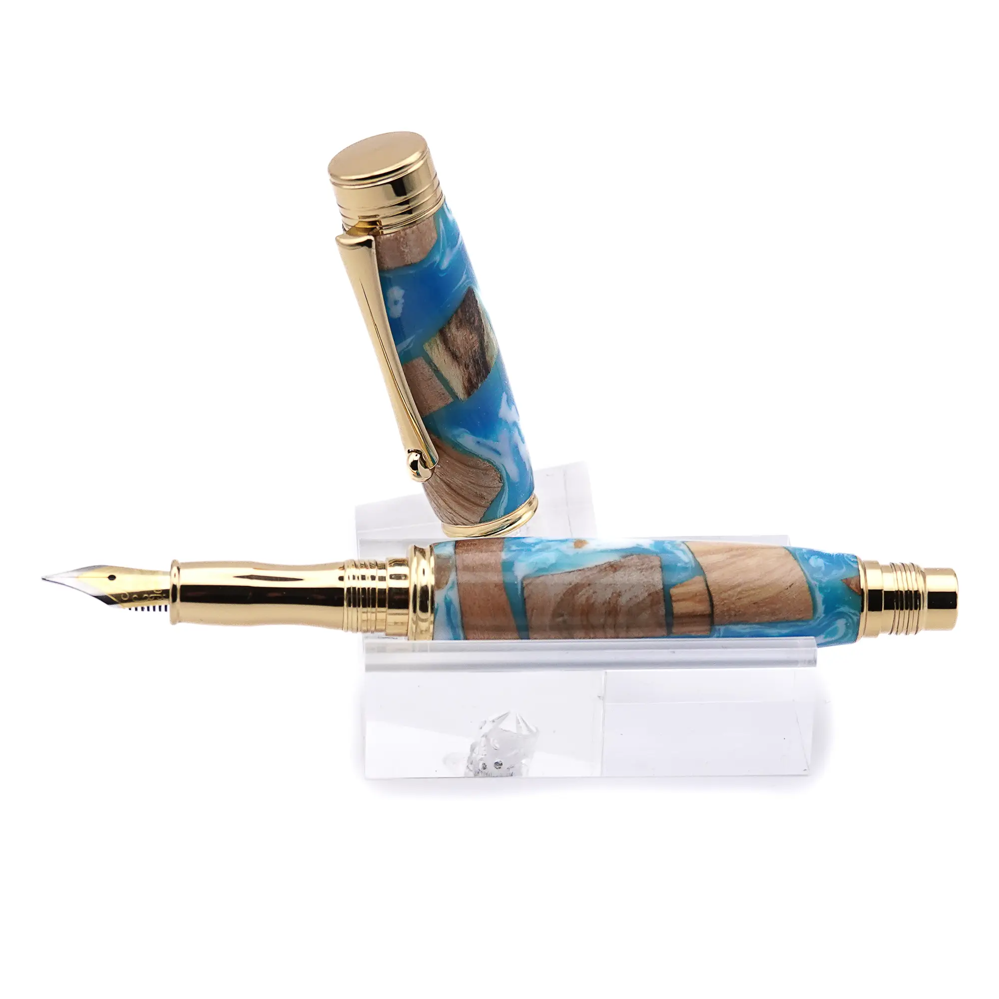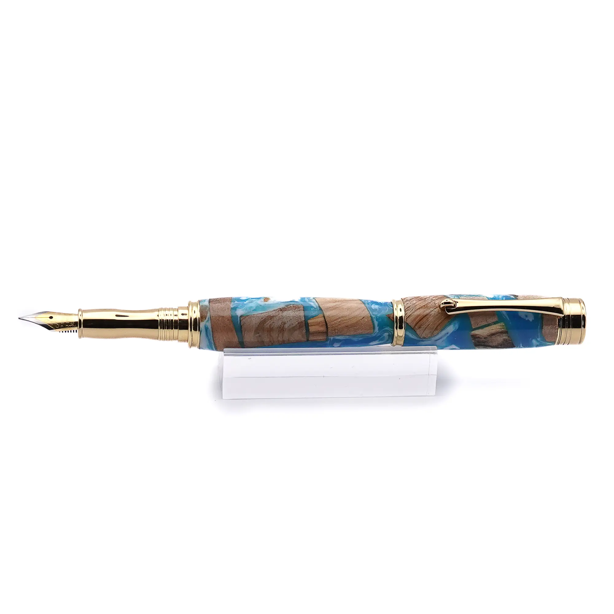 A great addition to the “Driftwood Collection”. This lovely Fountain Pen is NOT made from driftwood but has been constructed from wood offcuts in blue and white resin with Gold Plated Fittings to give the effect of wood floating in the sea. Each pen is unique, nicely balanced and a pleasure to use.