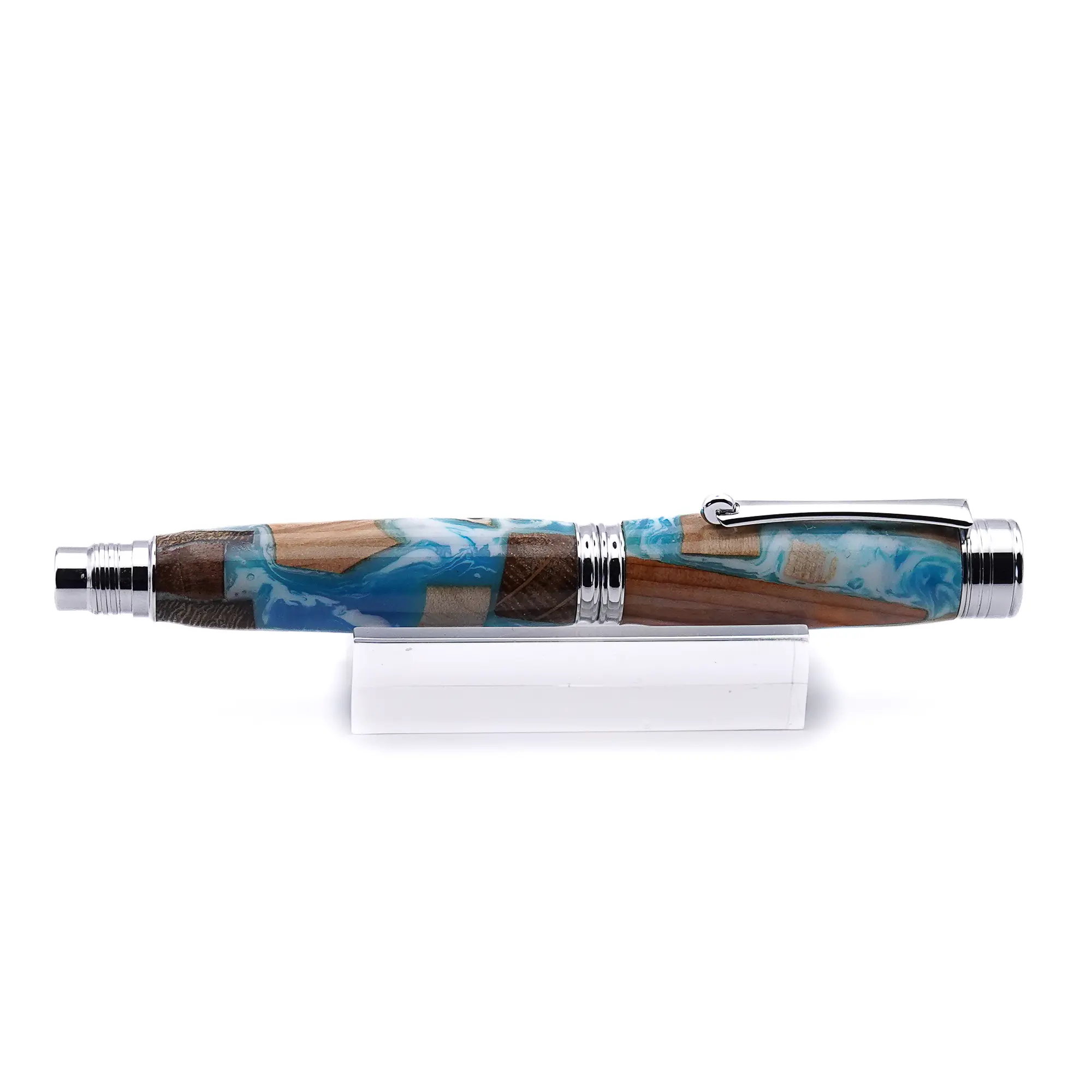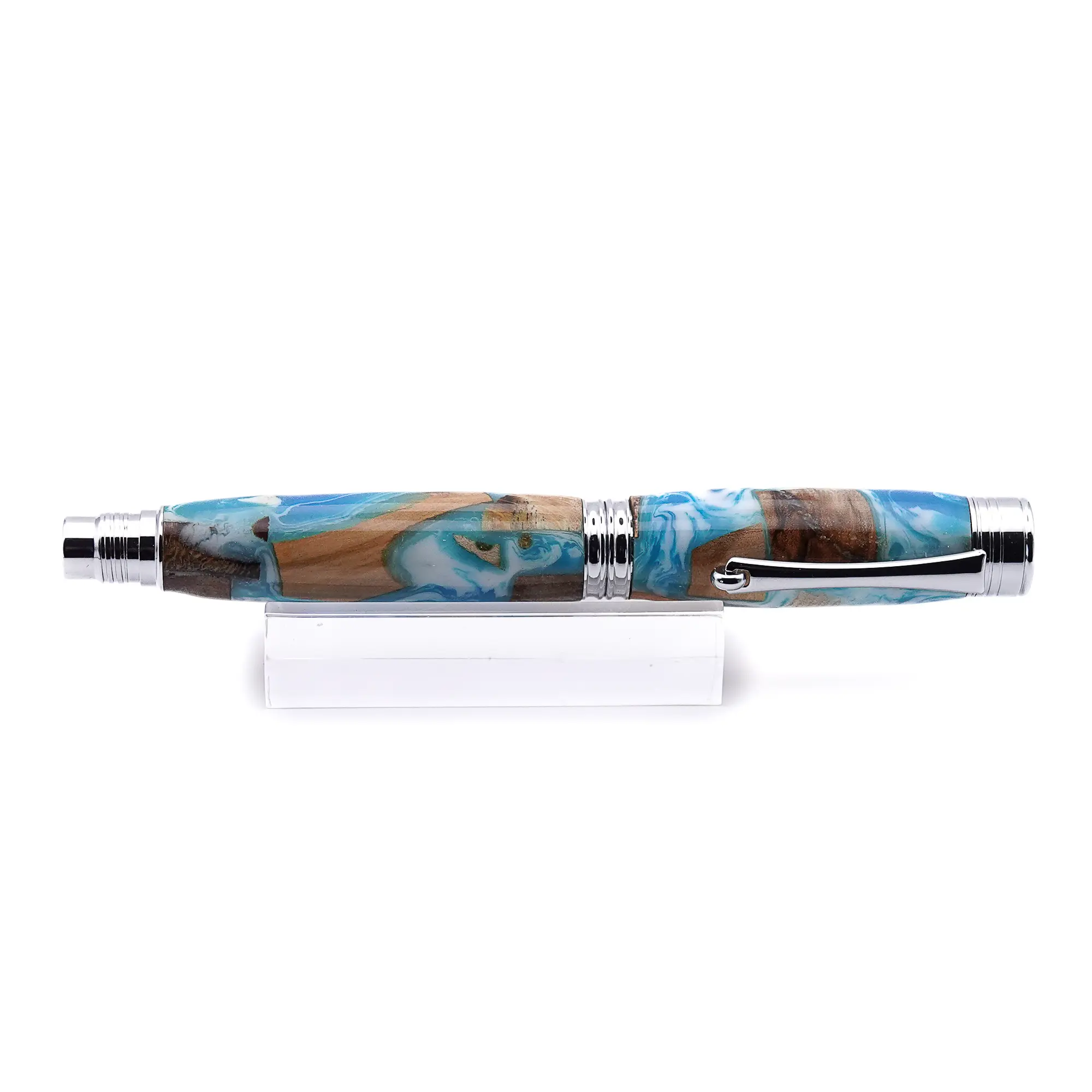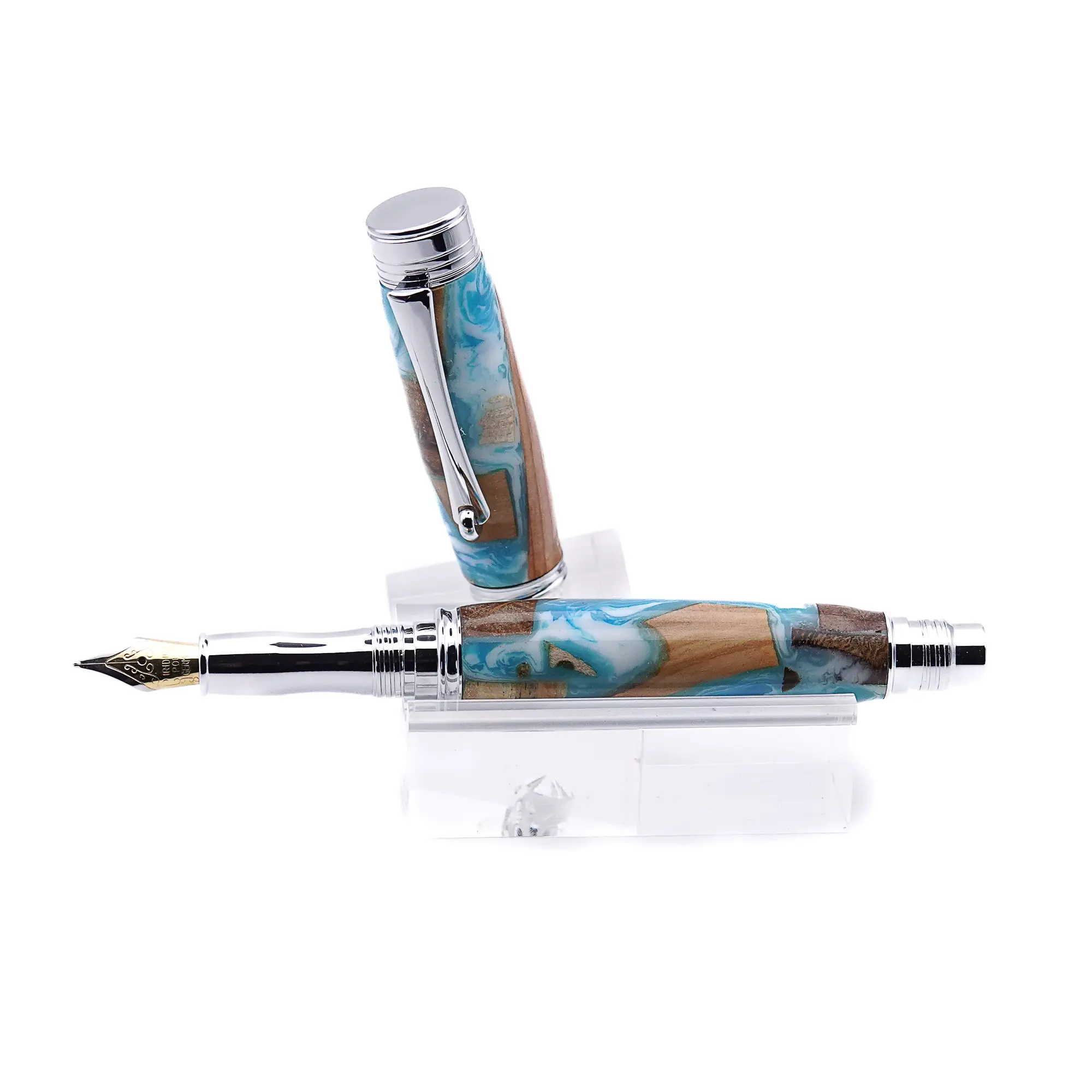 A great addition to the “Driftwood Collection”.  This lovely Fountain Pen is NOT made from driftwood but has been constructed from wood offcuts in blue and white resin with Chrome Plated Fittings to give the effect of wood floating in the sea. Each pen is unique, nicely balanced and a pleasure to use.