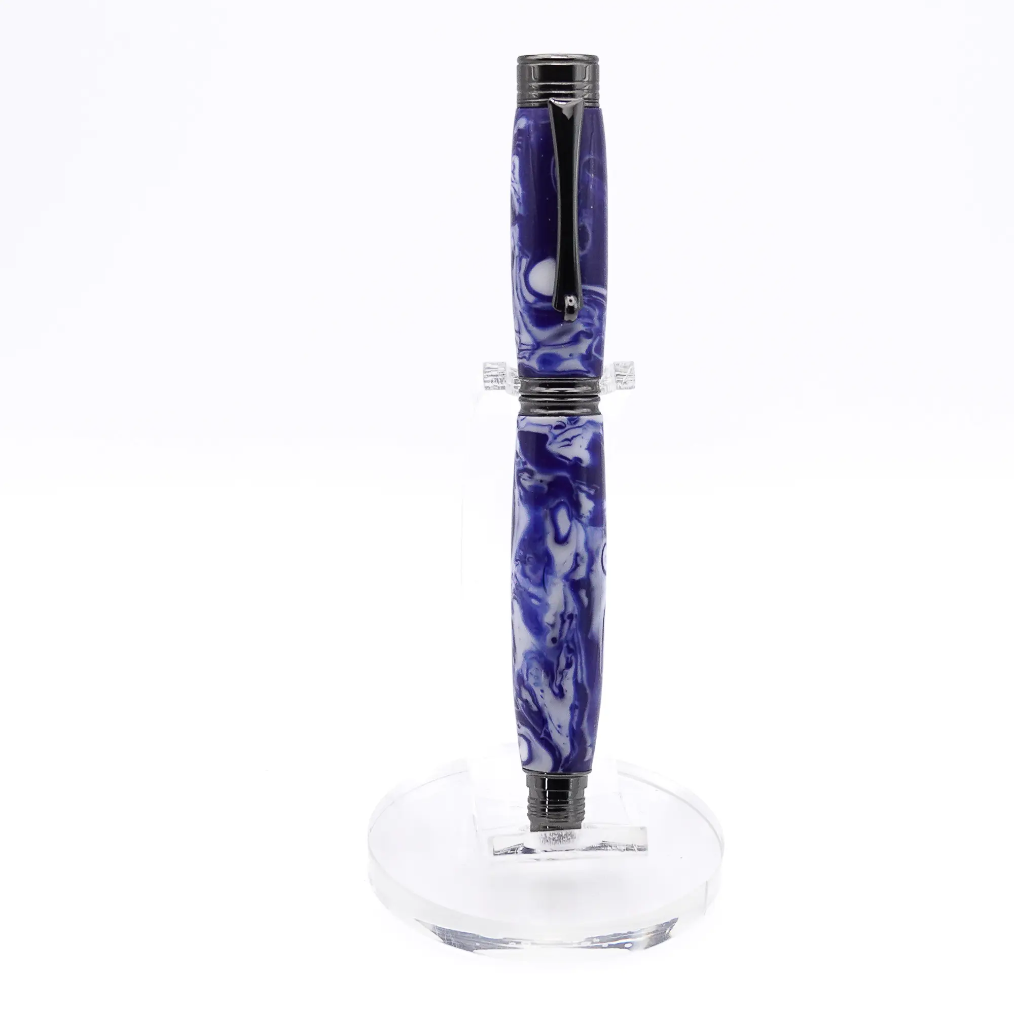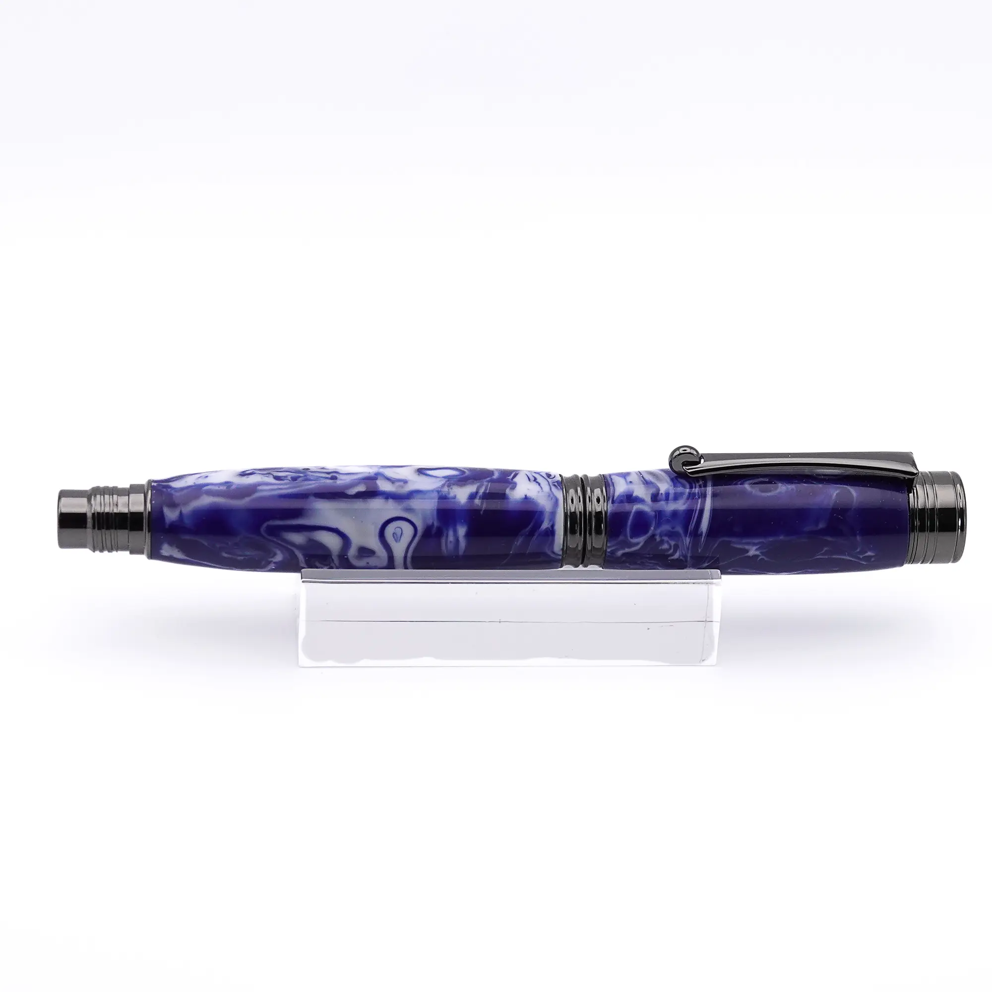 A beautiful Fountain Pen that has been constructed from a mixture of Blue and White resins (the pen blank is made by myself and not a bought one) with Gun Metal Plated fittings that compliments this pen nicely. It is nicely balanced and enjoyable to use.