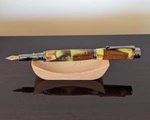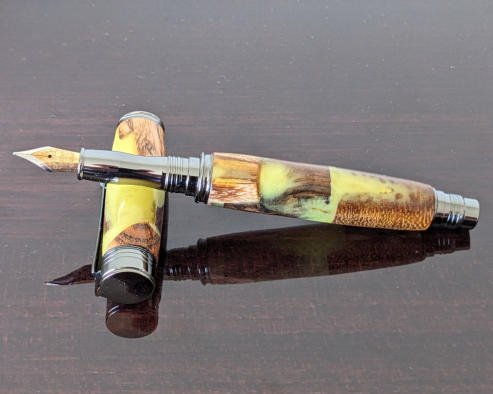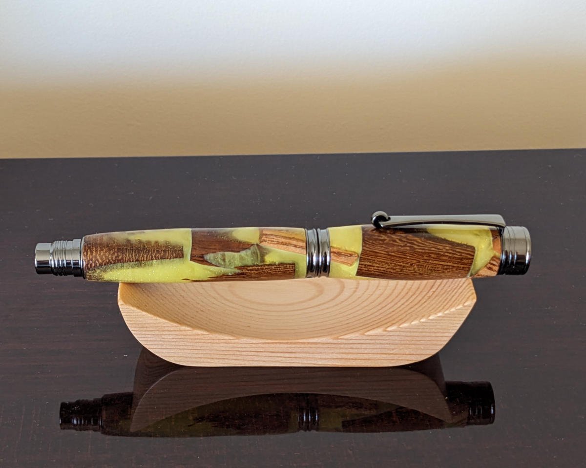 This is a stunning fountain pen which would be a pleasure to own. The finished pen is “pillared” so that the cap can be screwed on the back of the pen to extend it for anyone who likes to use a longer pen. The nib has an iridium point and comes in a black velveteen pouch. This pen has been made and is ready to post. Type of Pen: FountainPlated Fittings: Gun MetalConstruction Material: Yellow Resin, Wood OffcutsNib Colour: Gold with an iridium pointIncluded: Ink converter and ink cartridge. Comes complete with a black velveteen pen pouch.---------------------------------------------------------------------------All of my pens are UK post free and are usually dispatched within two days by 1st Class Mail (24 Tracked). For orders outside the UK please see the overseas postage charges and these will send by Tracked Royal Mail International Standard. Please note that buyers are responsible for any taxes and custom charges made once the pen has been posted and left the country.