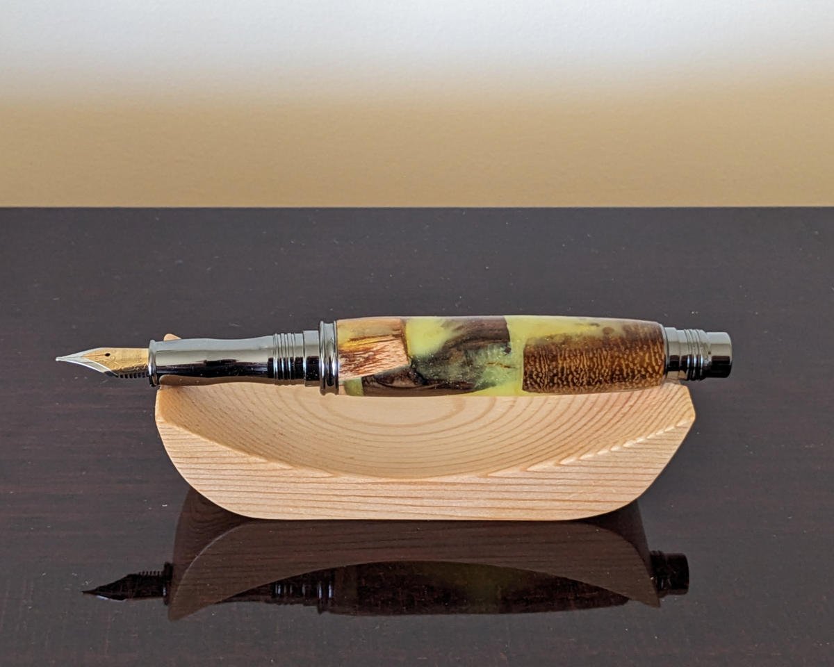 Myethoshasalwaysbeentotryandusesecond handorreclaimedtimberformypens,butthis stillleavesoffcutsoftimberorpiecesthatare notsuitableduetofaultsorwormandaremore orlessofnouse,beingtoosmalltomake anythingfrom.Itistheseoddpiecesthatyour pen is constructed from.Unique Fountain Pen in Yellow Resin and Scrap Wood with Gun Metal Fittings (402)