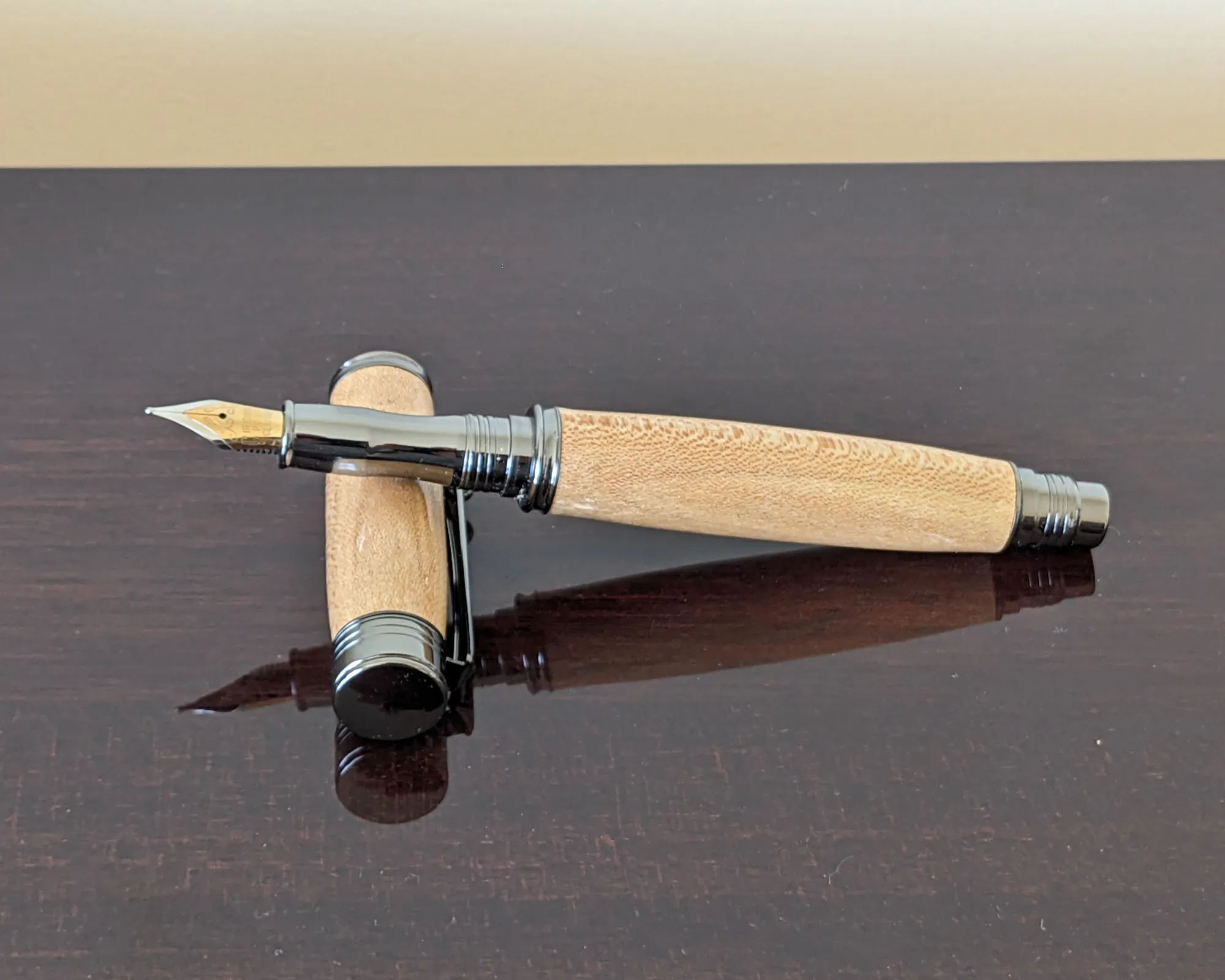 Lovely recycled Sycamore Fountain Pen with Gun Metal fittings that compliments the timber nicely. The finished pen is “pillared” meaning that the cap can be screwed on the back of the pen to extend it for anyone who likes to use a longer pen. The nib has an iridium point and comes in a black velveteen pouch. The pen being sold is the one in the picture and ready to post.