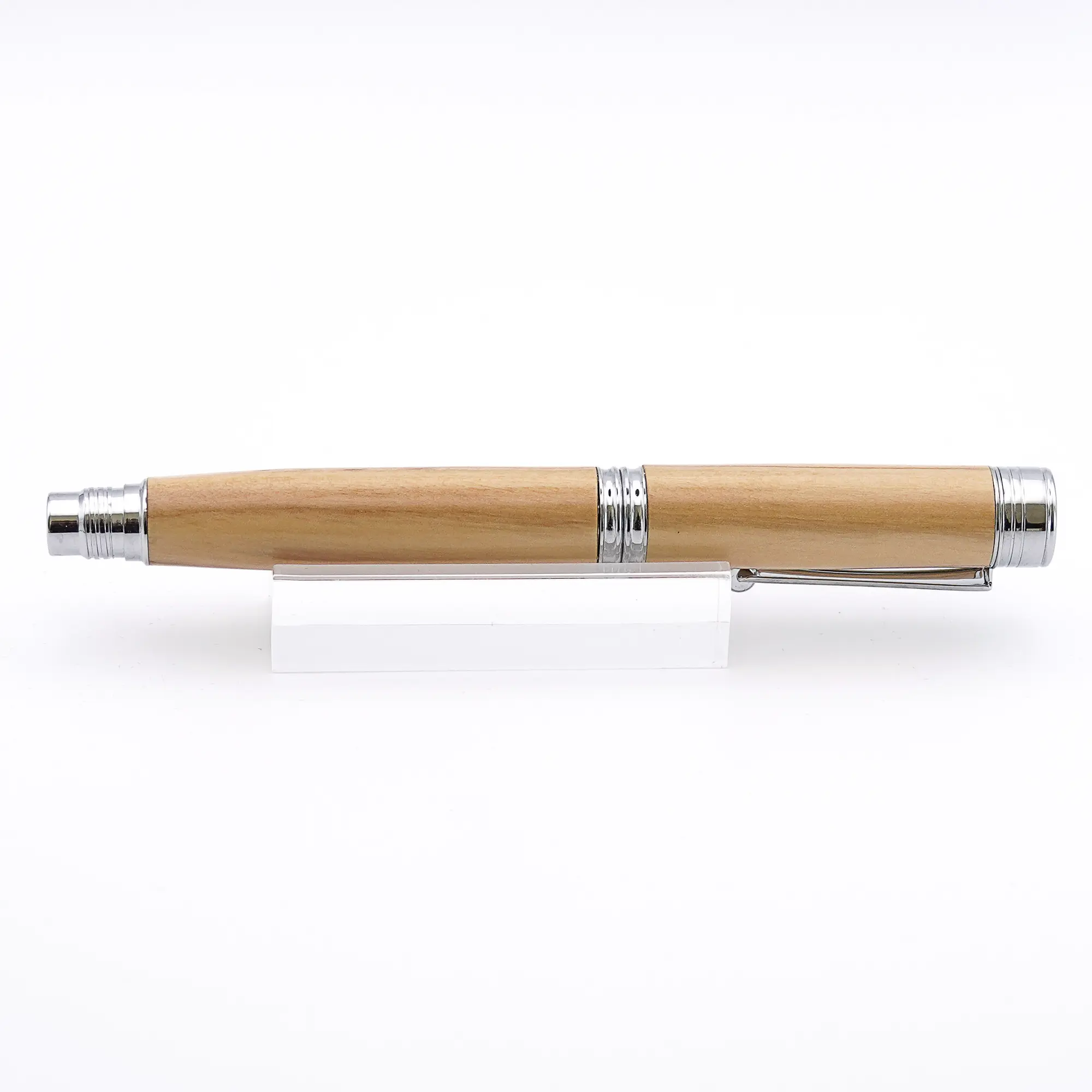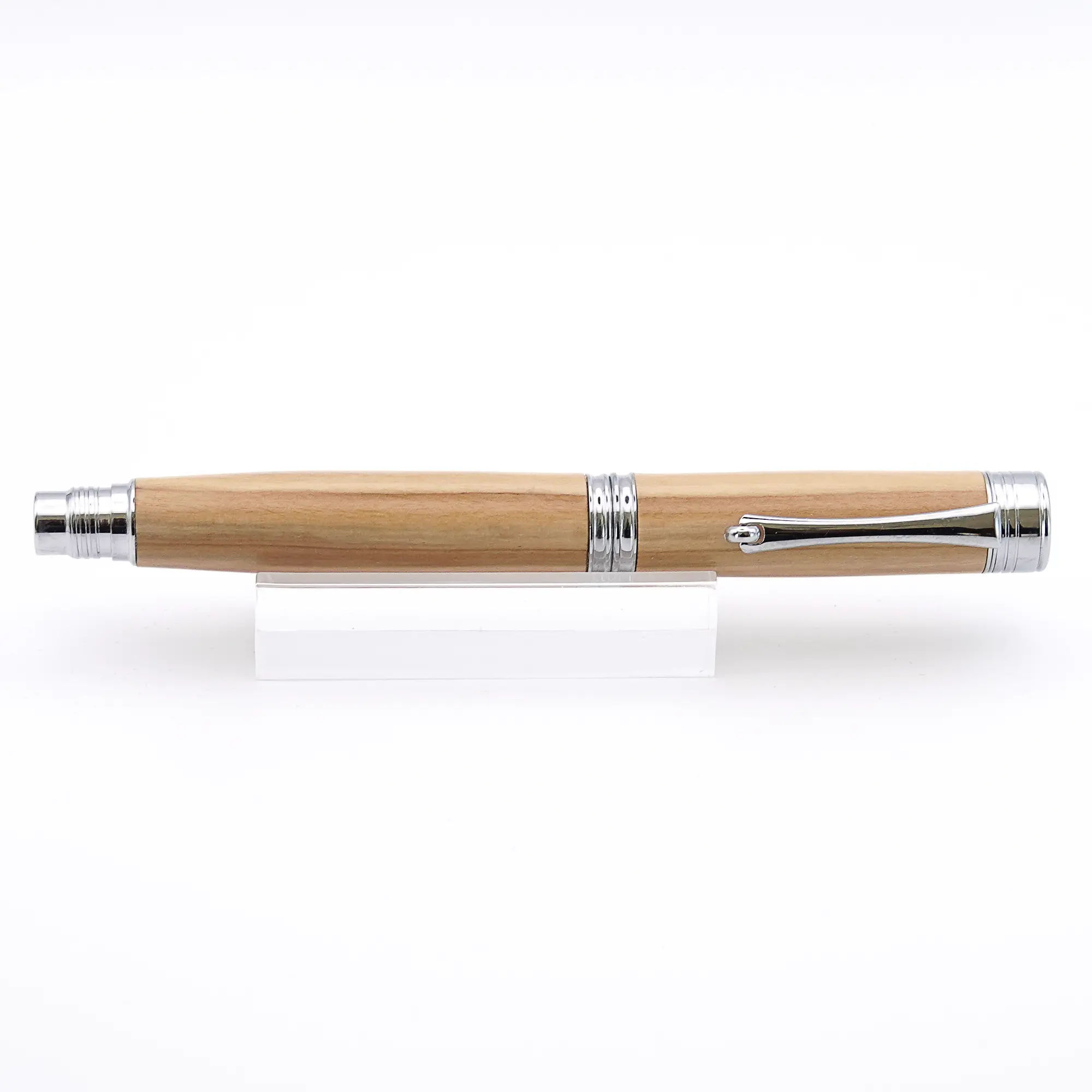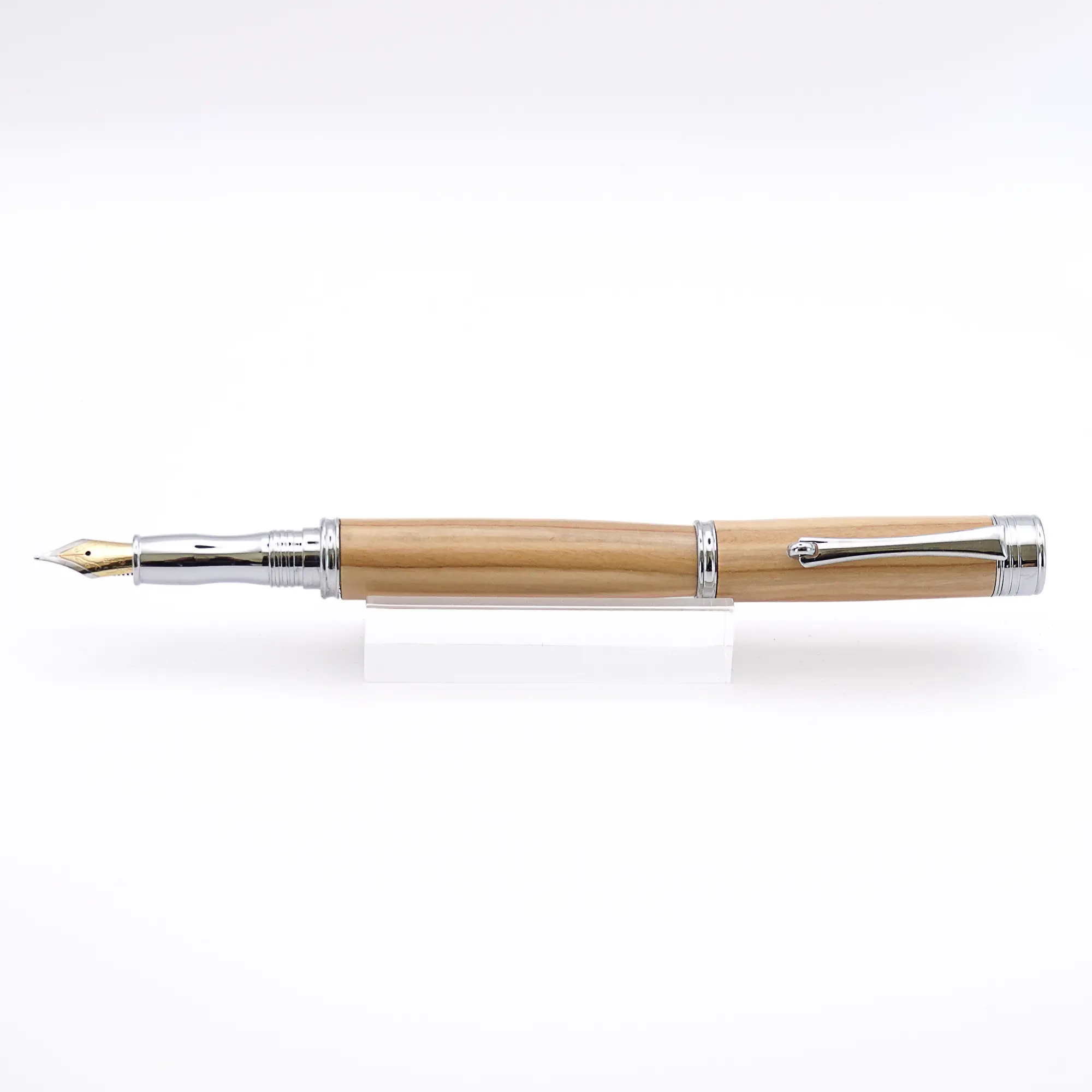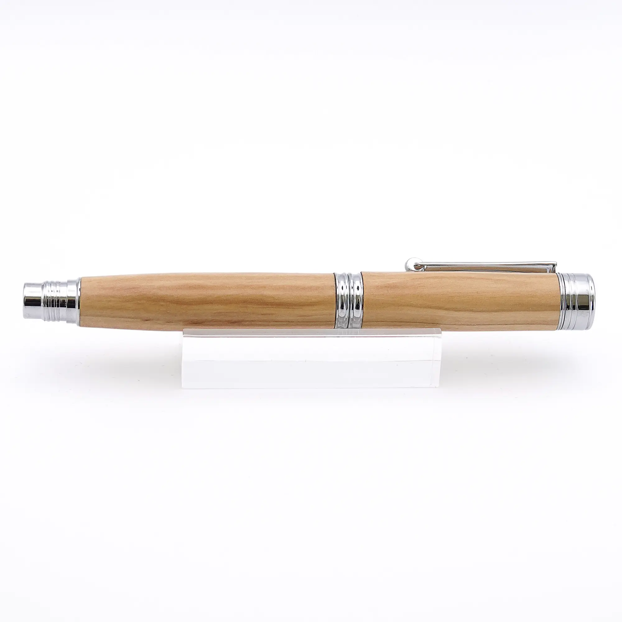 One of the most beautiful woods for a Fountain Pen is Mediterranean Olive Wood. This particular pen has Chrome plated fittings and the finished pen is “pillared” meaning that the cap can be screwed on the back of the pen. This is good for anyone who likes to use a longer pen.