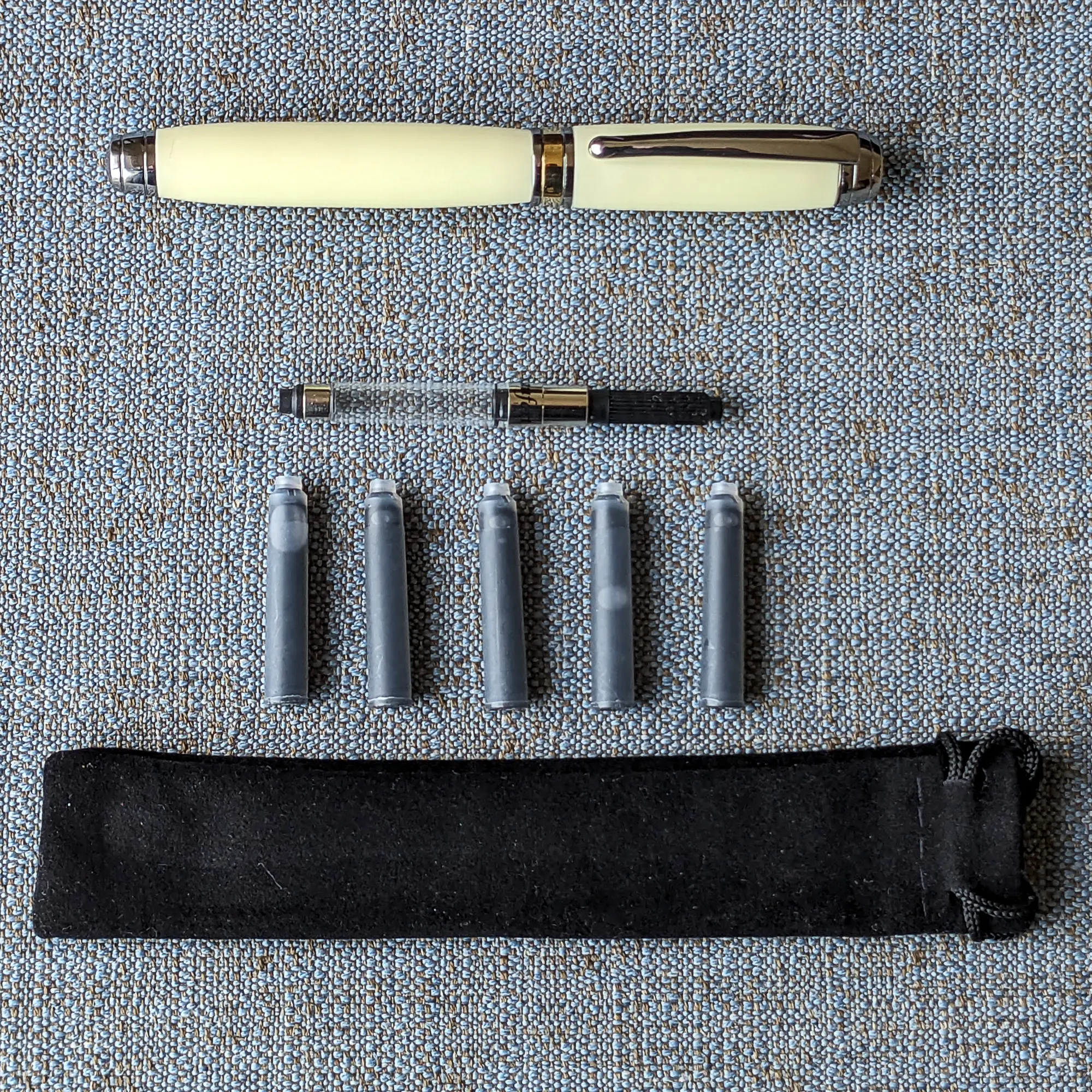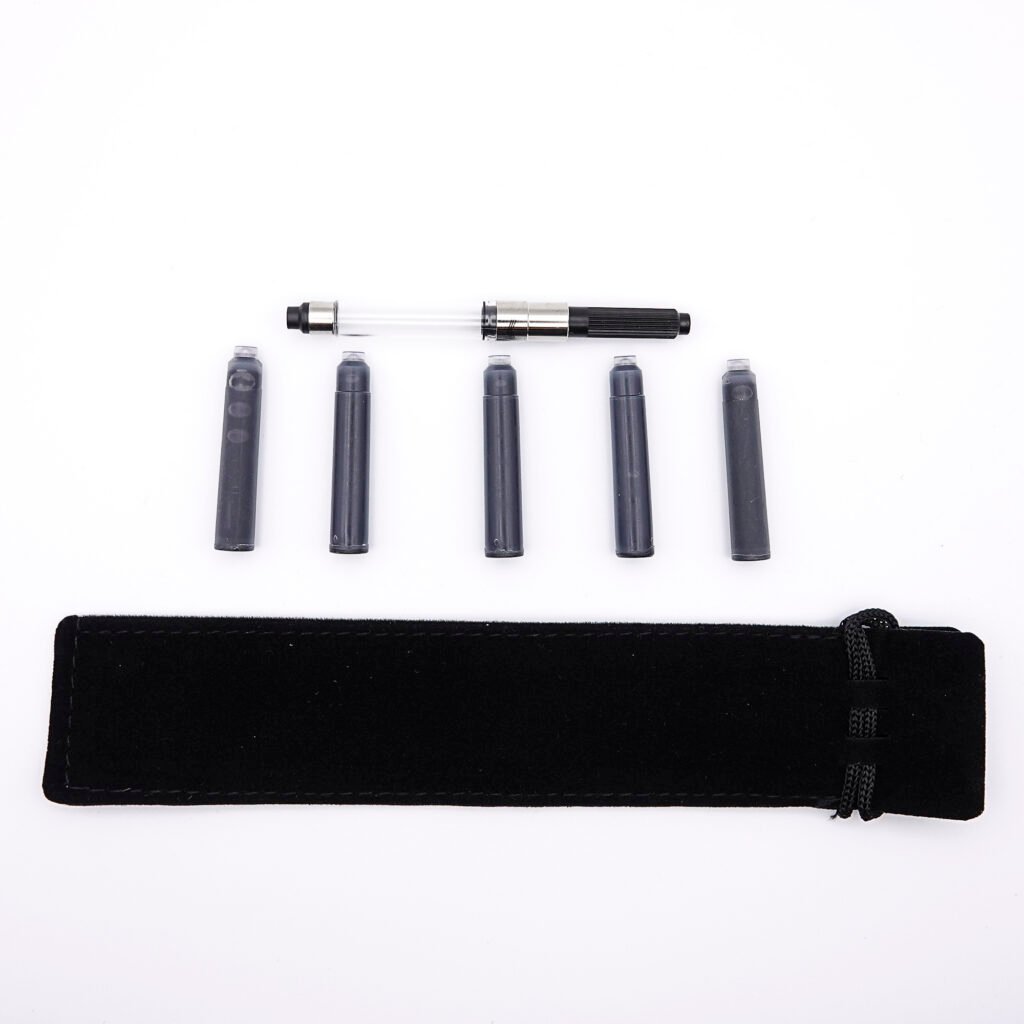 Included: Ink converter and ink cartridges. Comes complete with a black velveteen pen pouch (or black velvet pen box with white and blue interior for an extra charge).