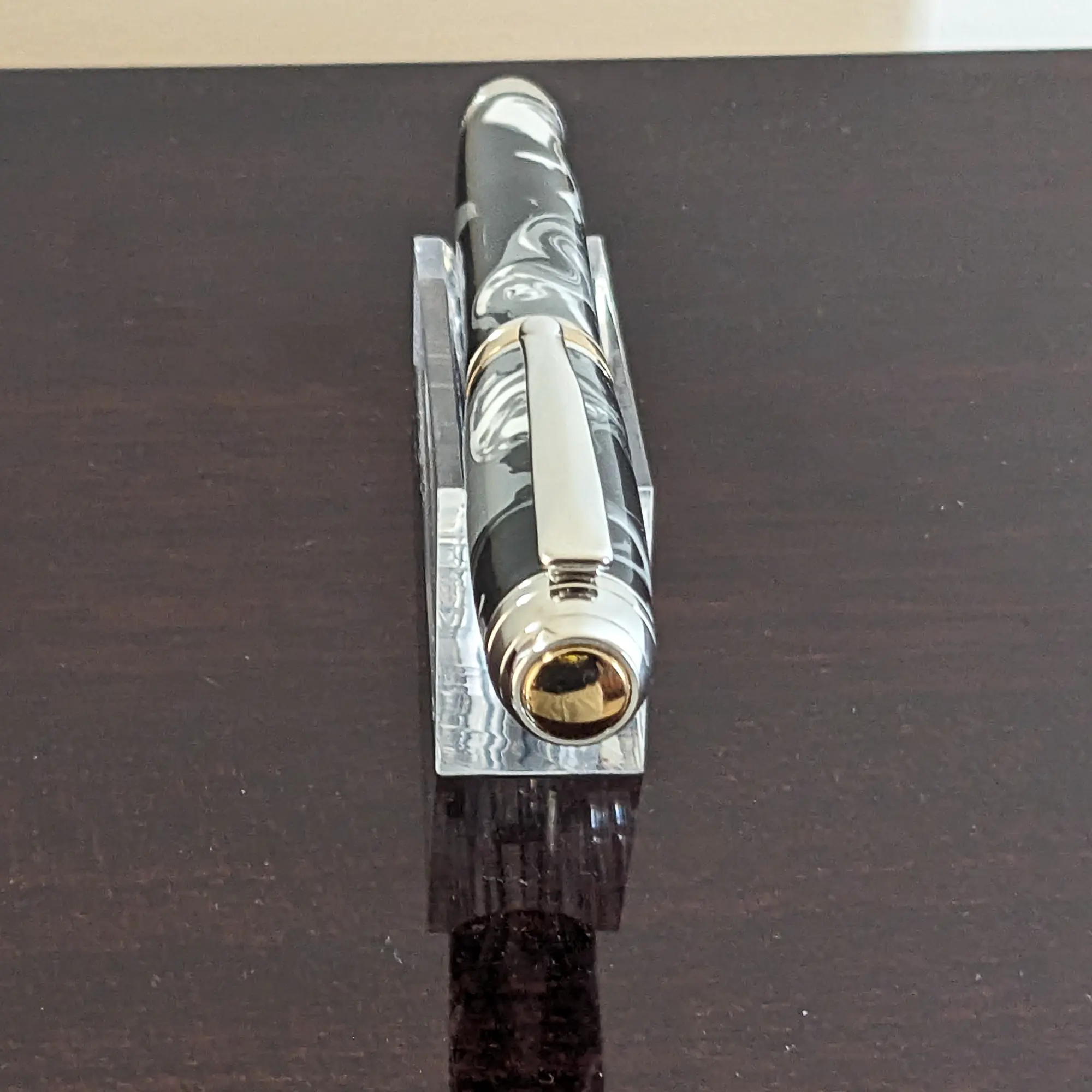 This is a stunningly beautiful, luxury, top of the range, fountain pen with the highest quality fittings that should last a lifetime. Made from Black, White and Grey Resin with Rhodium Plating and Titanium Gold Centre Ring and Cabochon making a lovely, elegant pen that would grace any desk or office. Rhodium is a much tougher finish than normal plating and therefore is a harder wearing finish on this pen making it almost impossible for the plating to wear.
