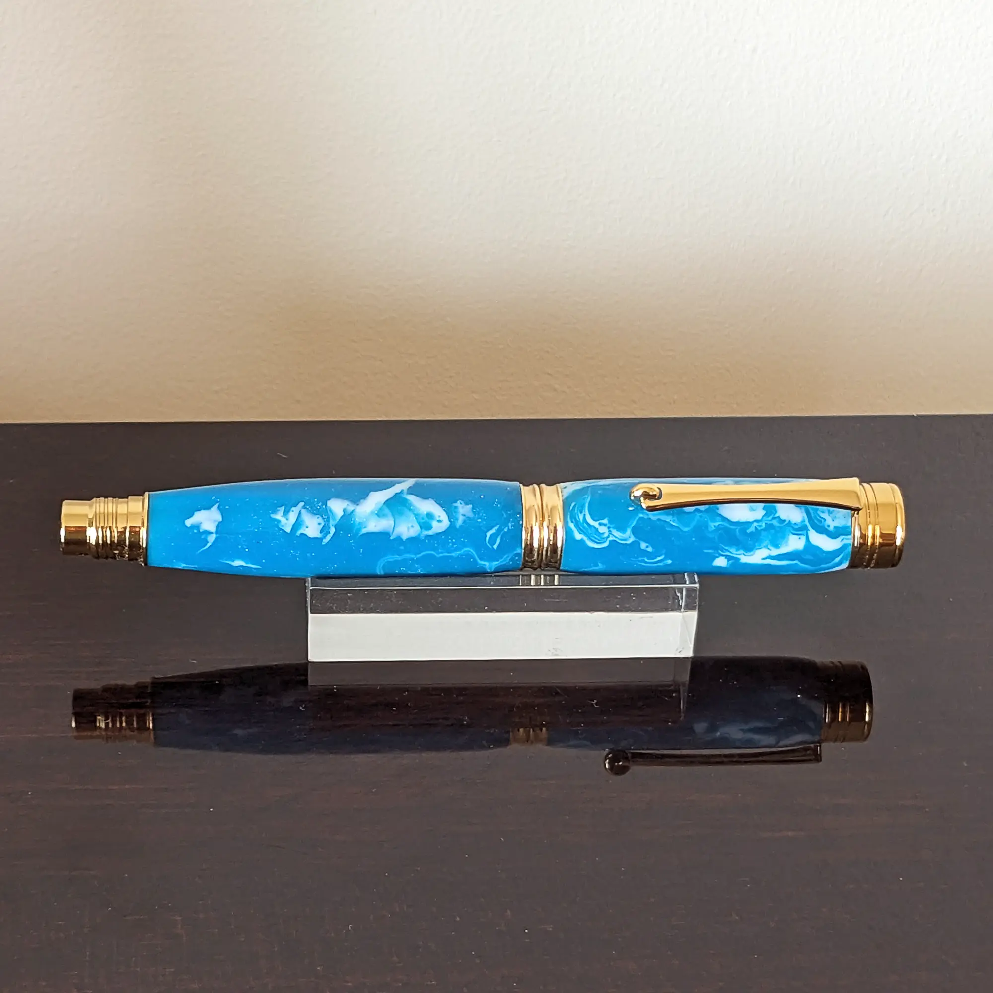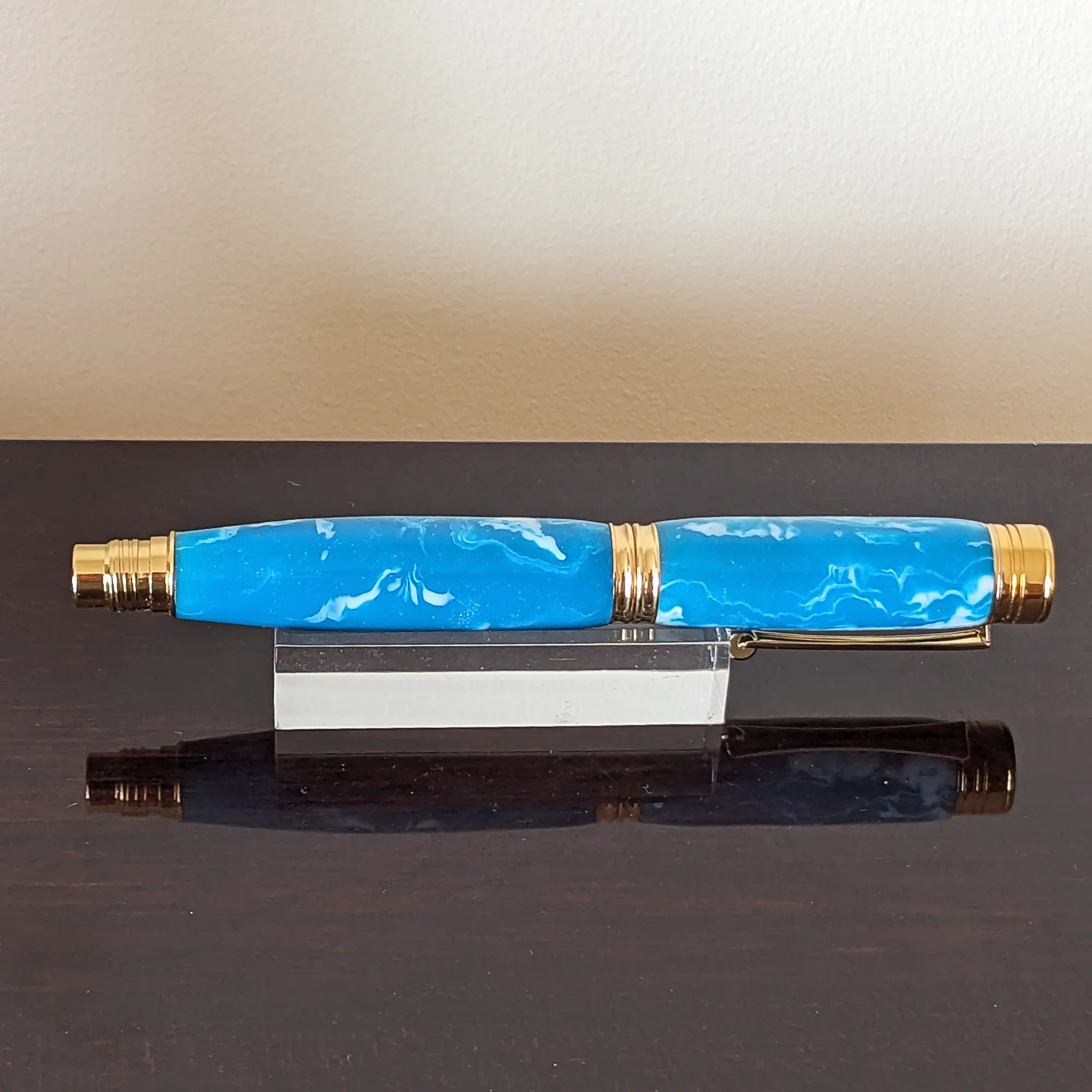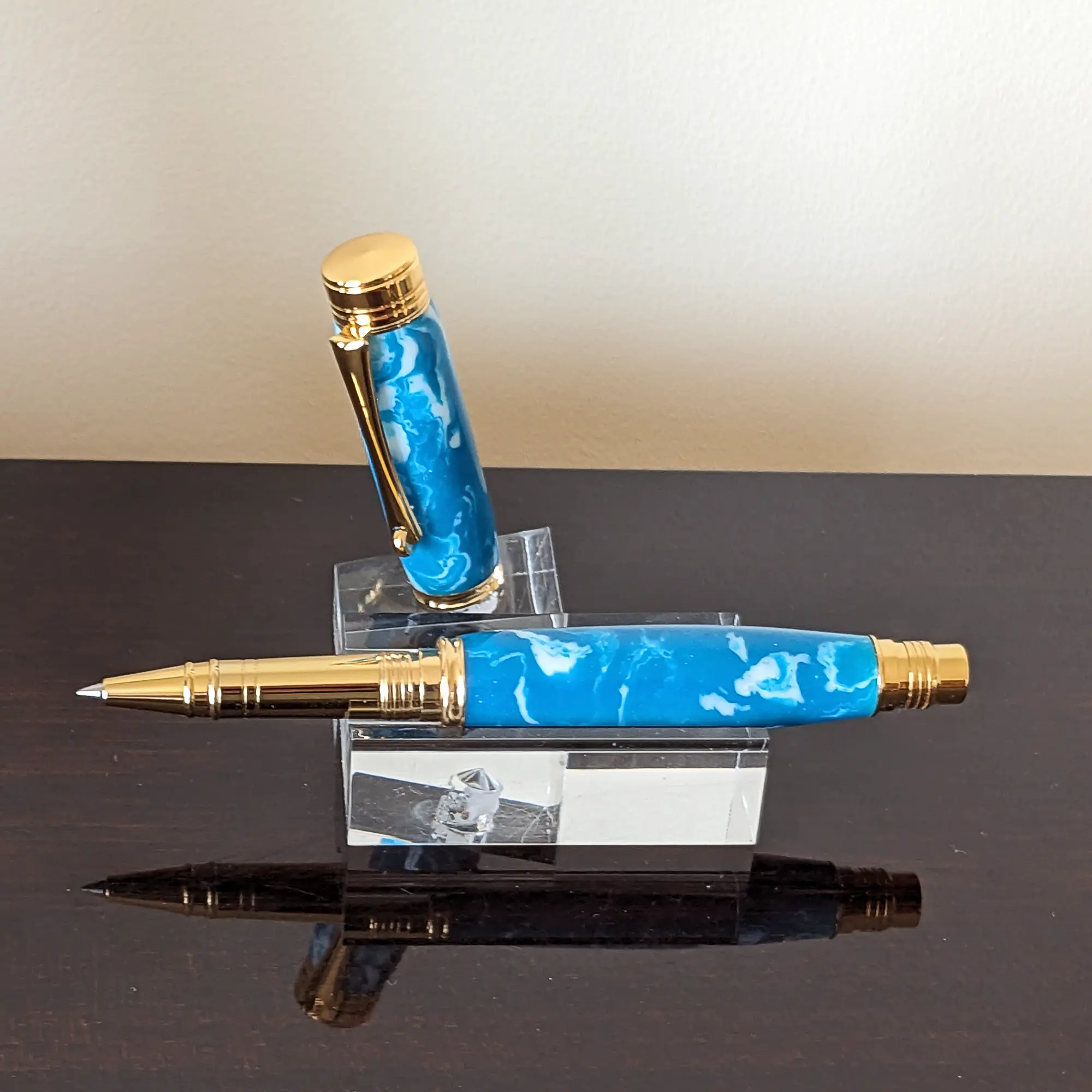 This is a beautiful Rollerball Pen made from Resin that has been dyed to give a blue and white colour with Gold Plated fittings that compliments this pen nicely.