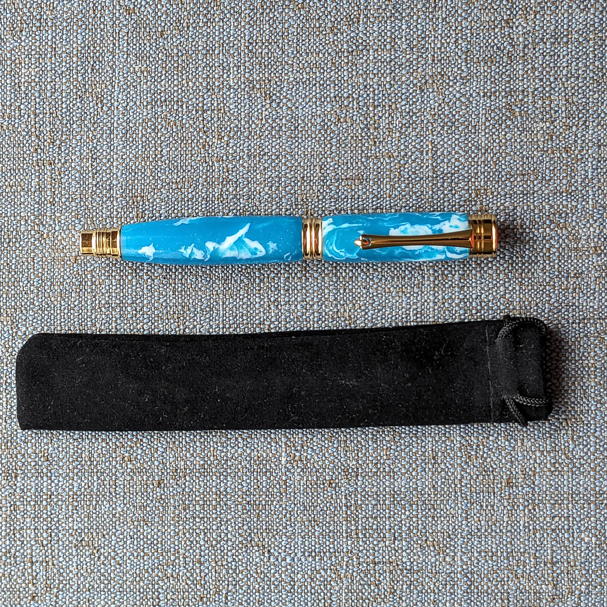 The finished pen is “pillared” meaning that the cap can be screwed on the back of the pen to extend it. This is ideal for anyone who likes to use a longer pen. It also comes in a black velveteen pouch to protect it (or black velvet pen box with white and blue interior for an extra charge).