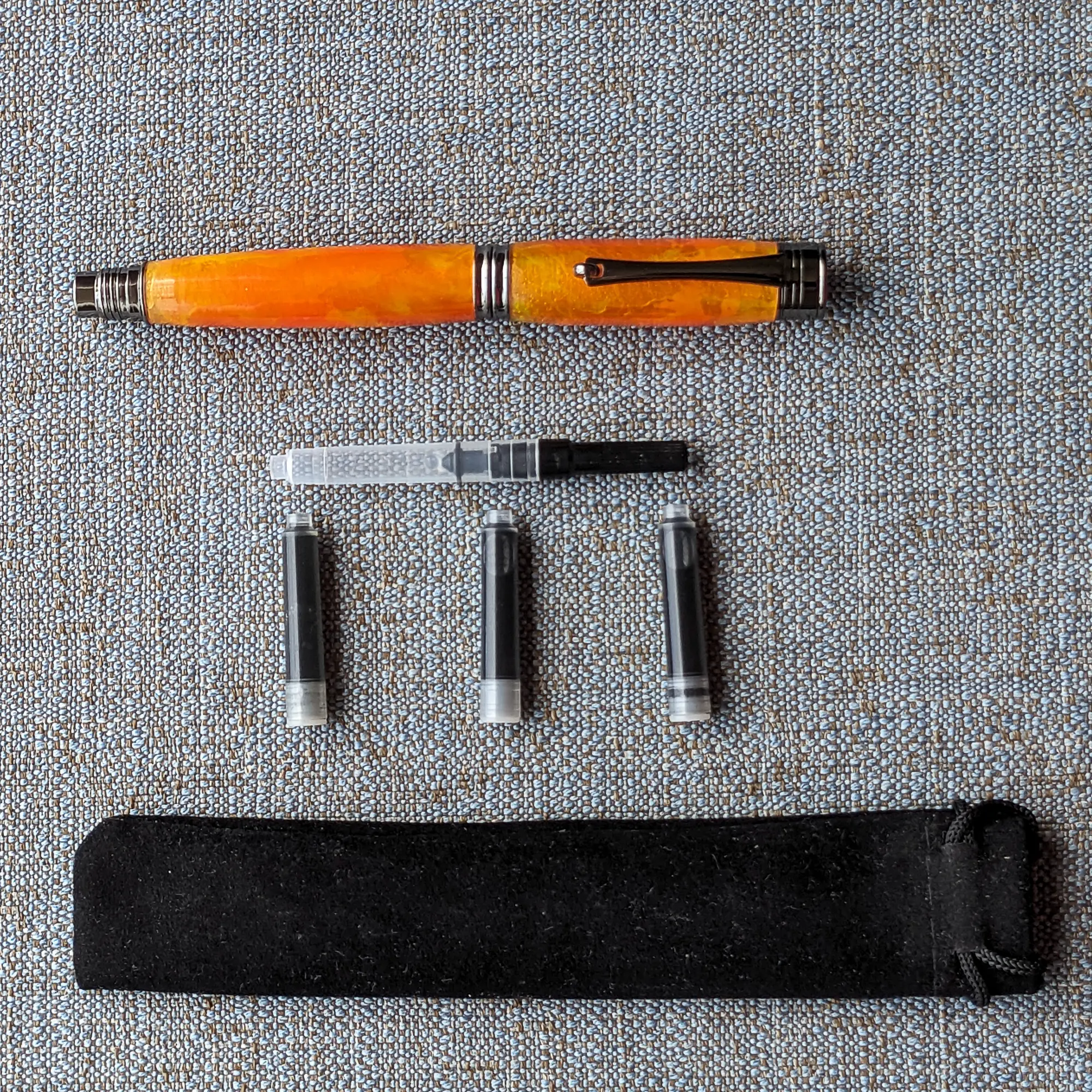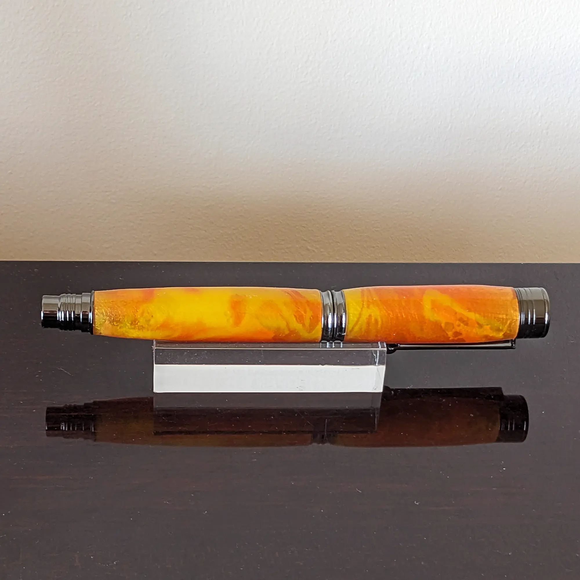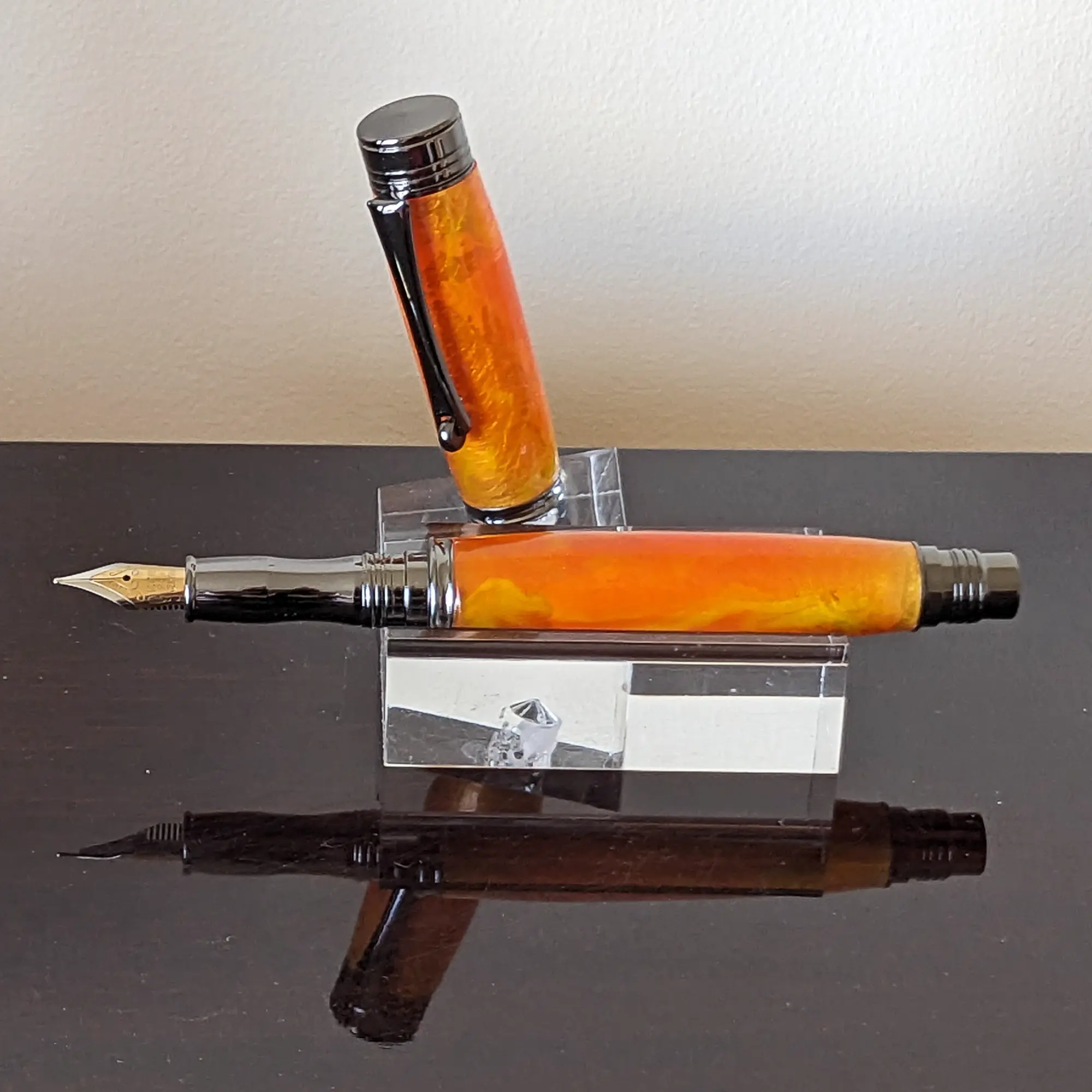 This is a lovely Fountain Pen that has been constructed from a mixture orange and yellow resins to give a unique effect with Gun Metal Plated fittings that compliments this pen nicely. It is nicely balanced and a joy to use. This pen is unique and made using resin and top-quality components. Once turned and sanded; to give the best possible protection it has several coats of finish and then a polish.