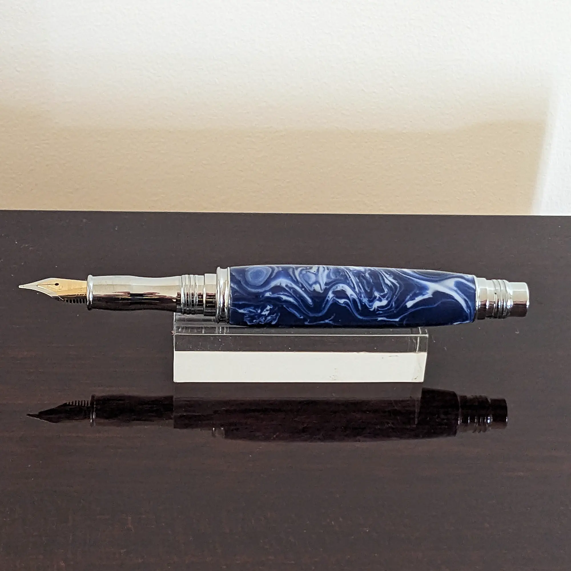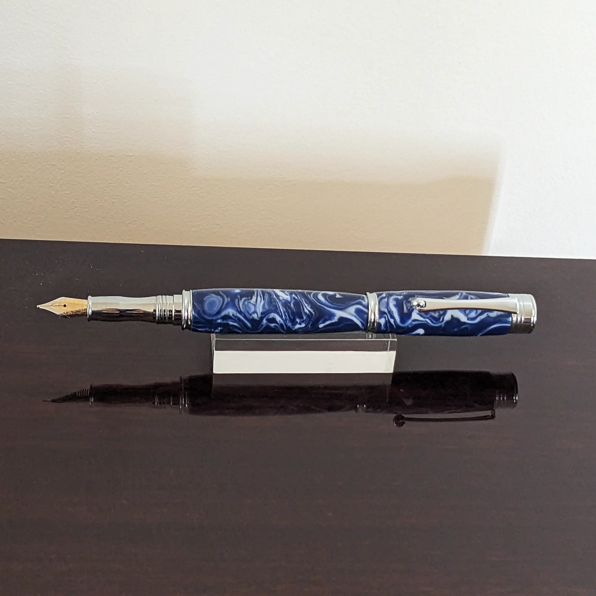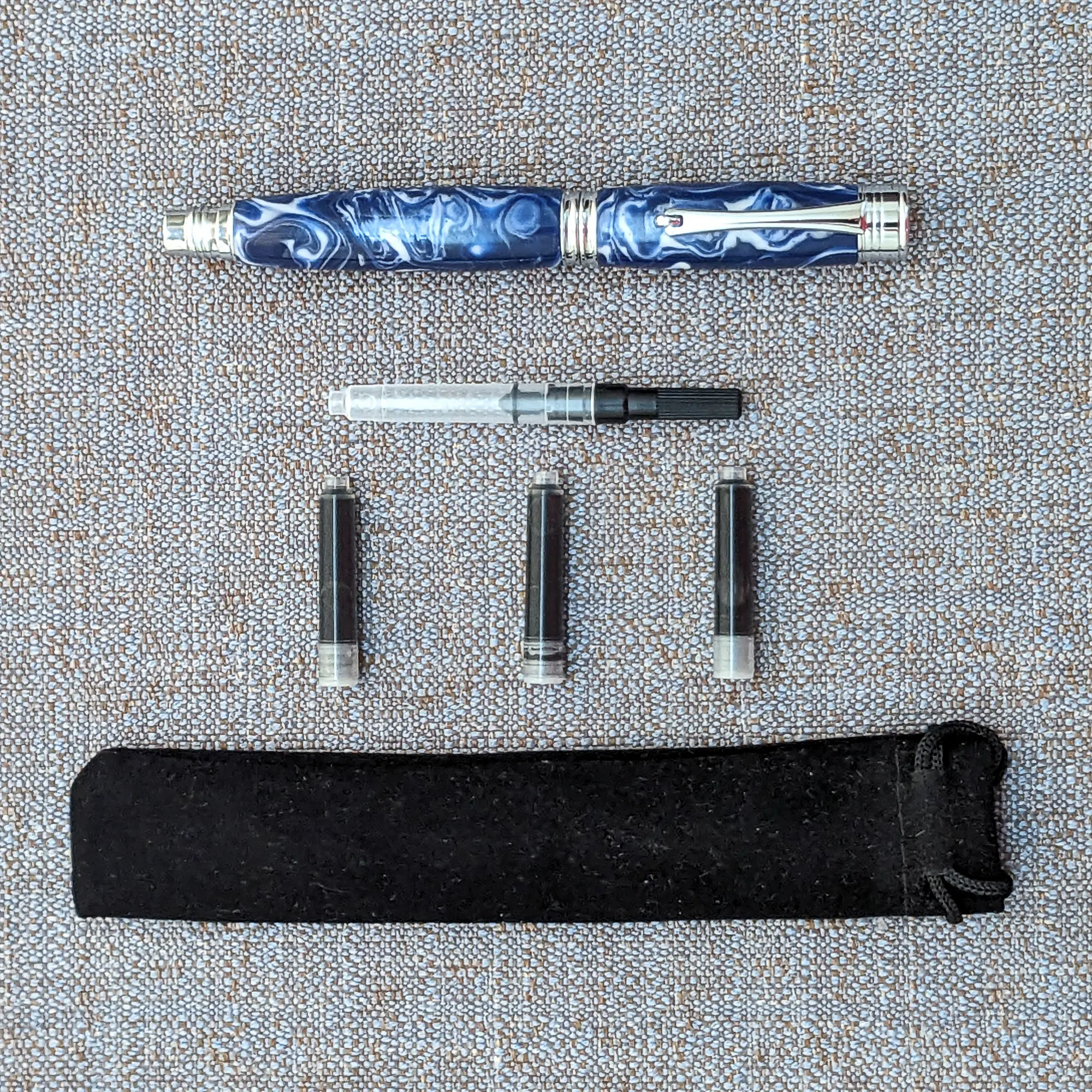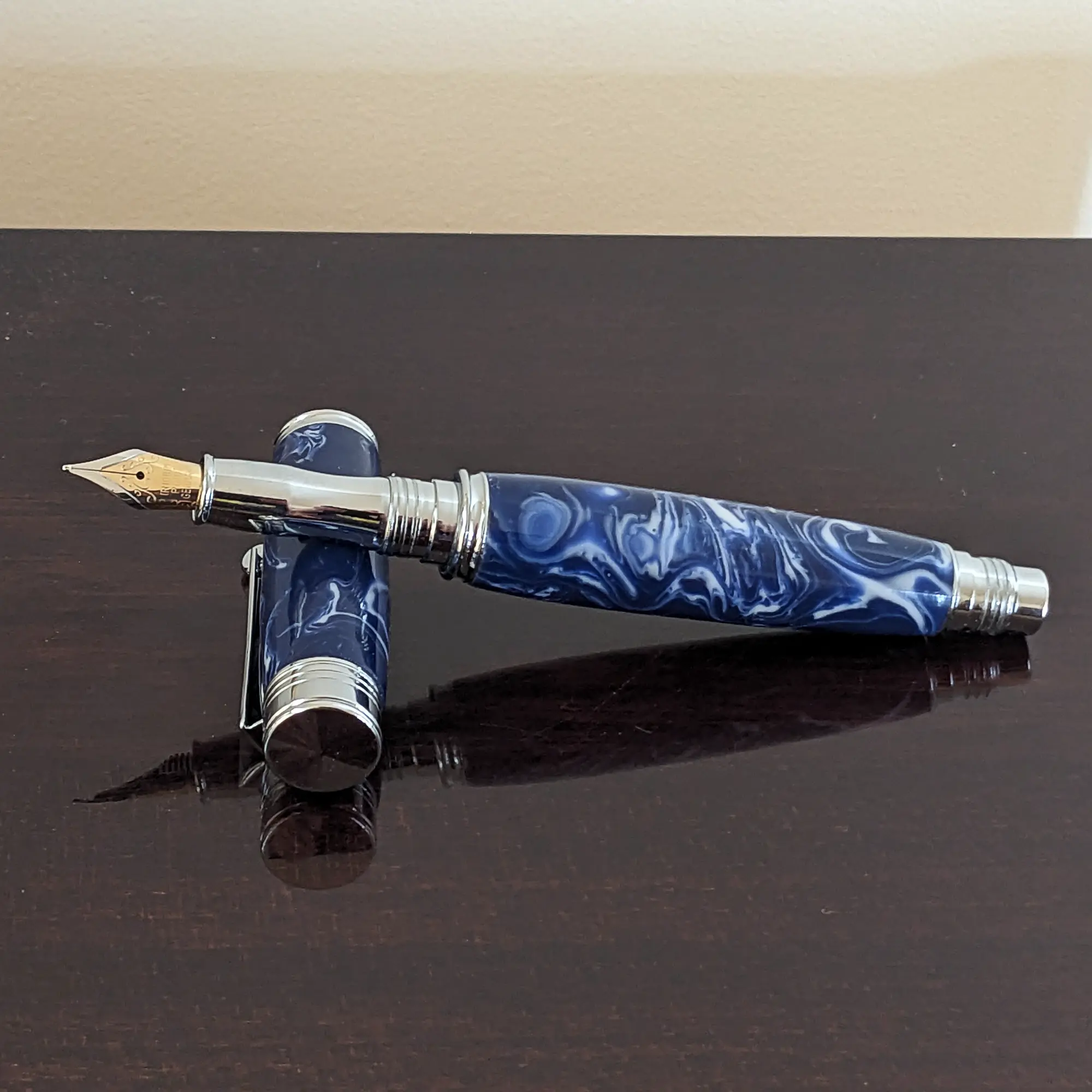 Beautiful Fountain Pen that has been constructed from a mixture of Blue and White resins to give a unique effect with Chrome Plated fittings that compliments this pen nicely. It is nicely balanced and enjoyable to use.