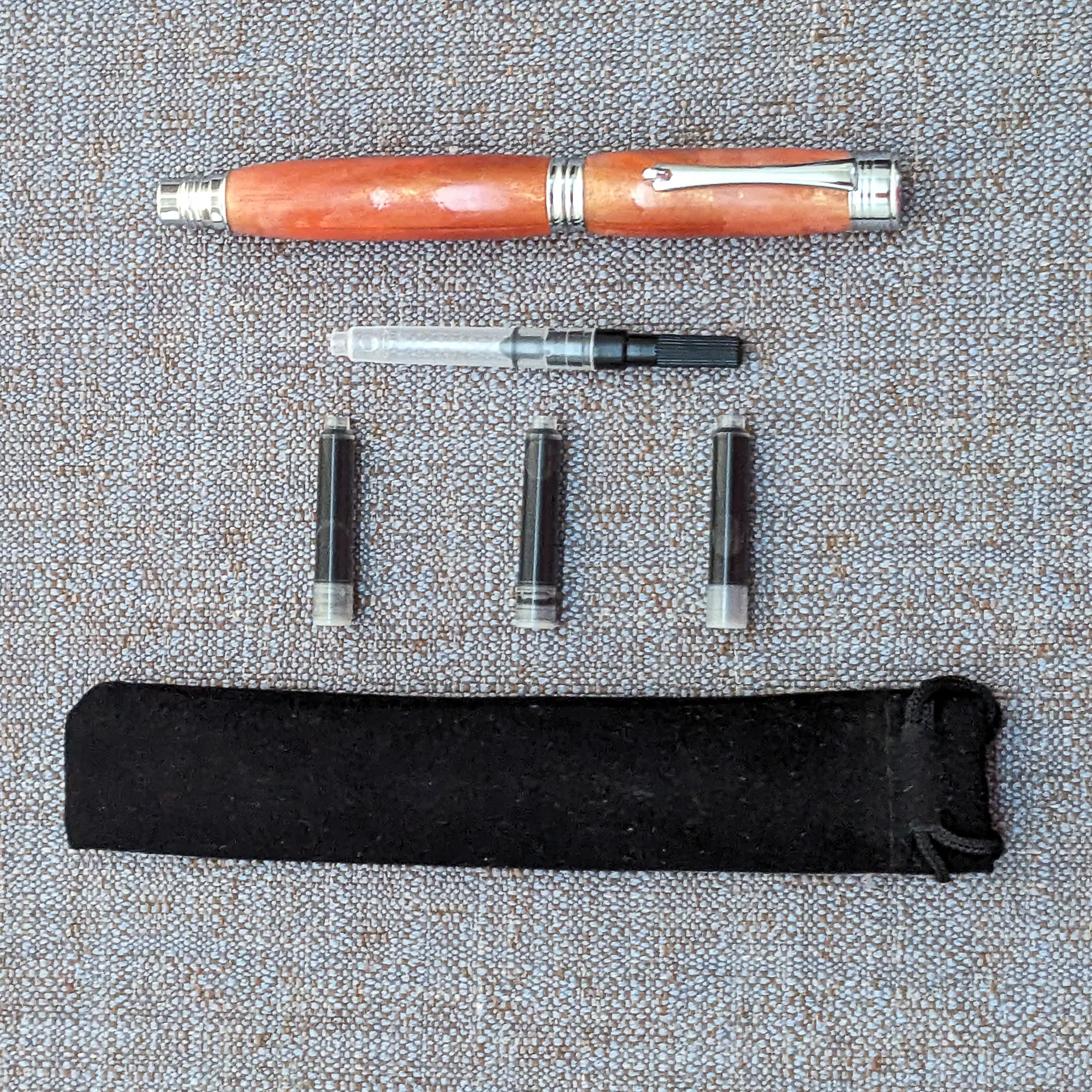 Included: Ink converter and ink cartridges. Information Sheet. I also supply a certificate of authenticity, confirming I turned the pen personally and the date it was constructed. It comes complete with a black velveteen pen pouch (or black velvet pen box with white and blue interior for an extra charge).