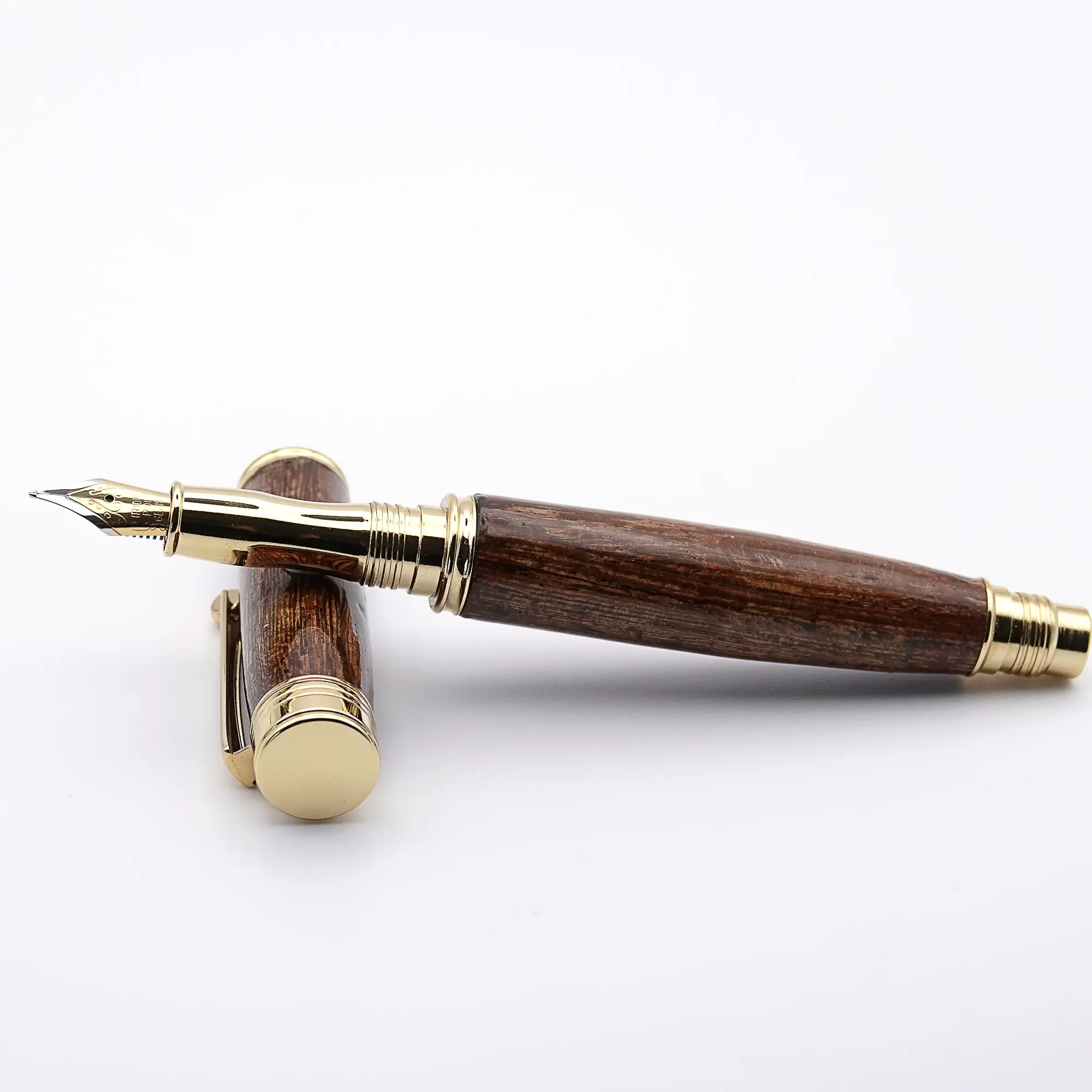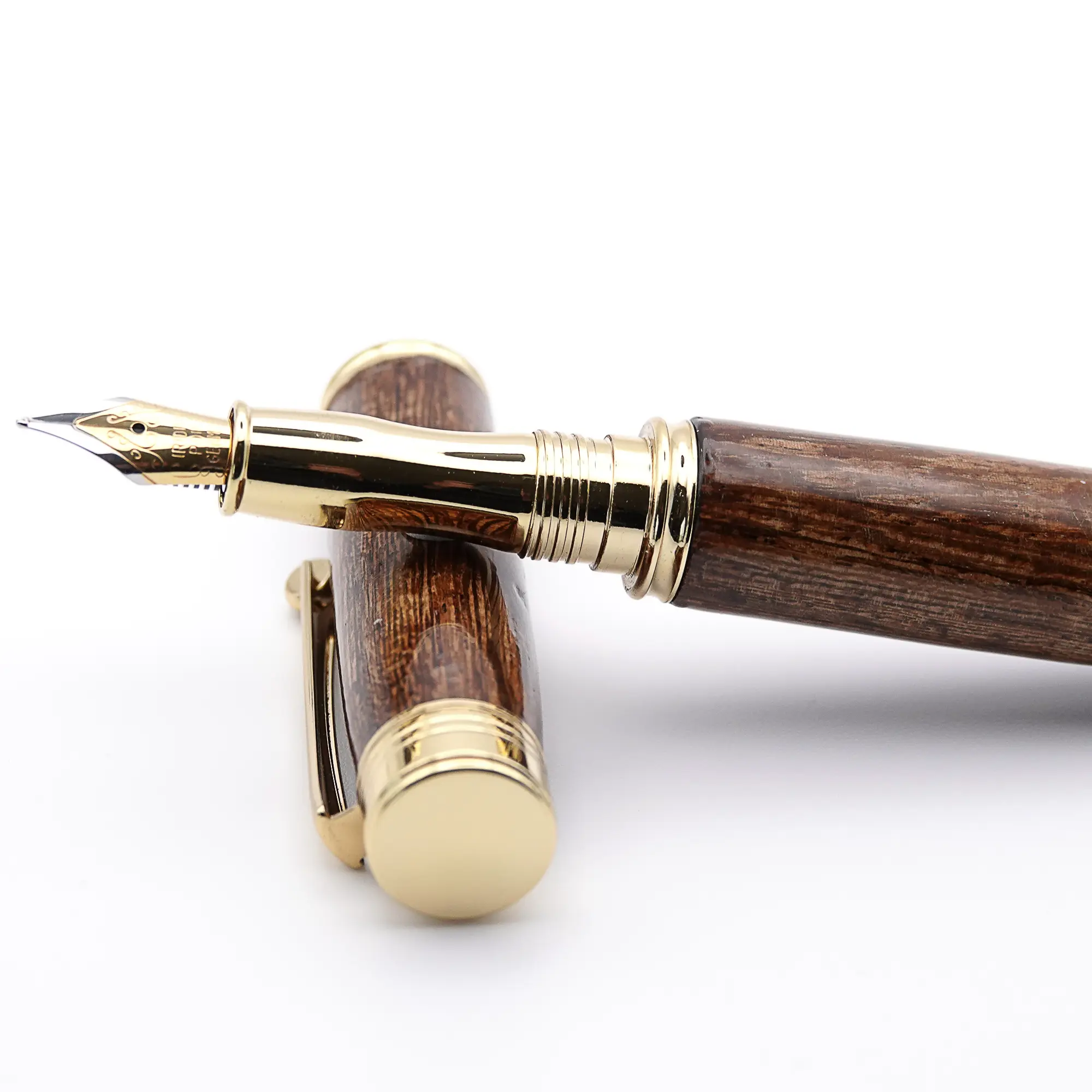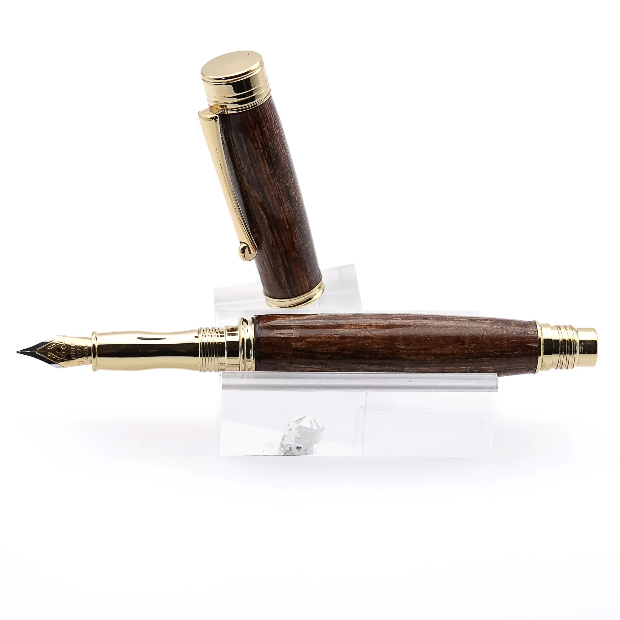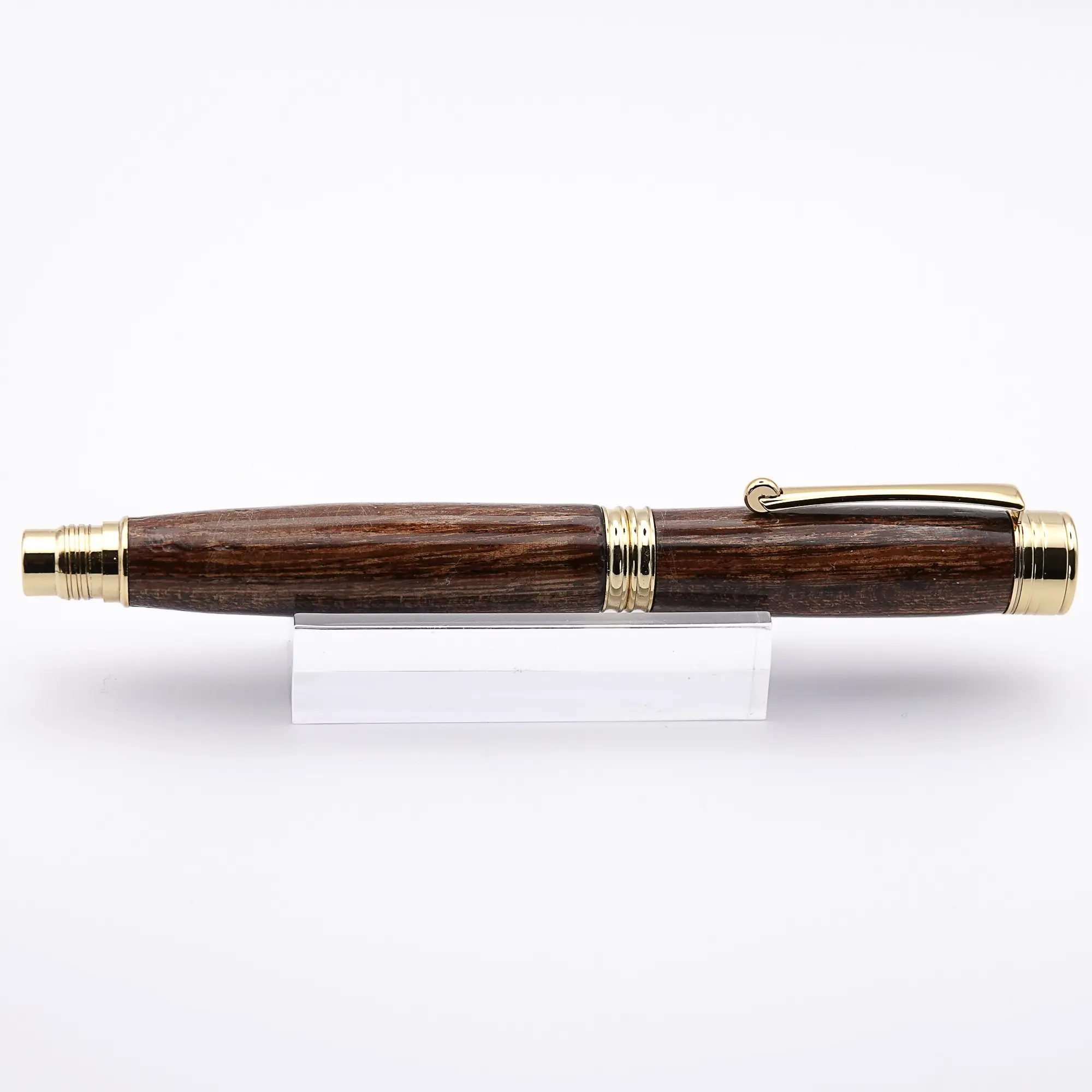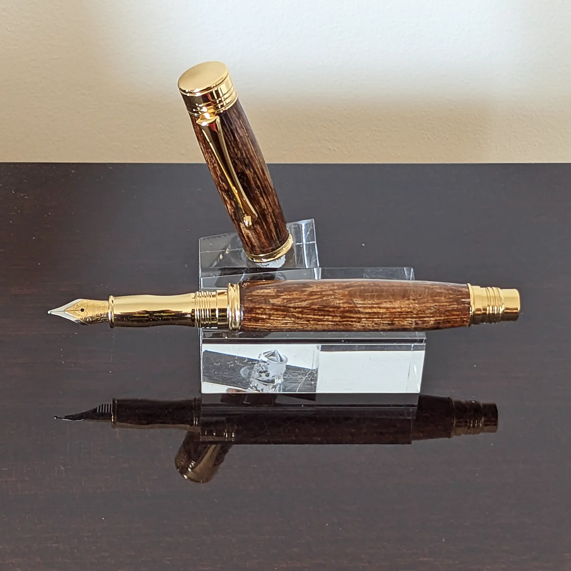 This Fountain Pen is constructed from a repurposed piece of Panga Panga with Gold Plated Fittings. The pen is “pillared” so that the cap can be screwed on the back of the pen to extend it for anyone who likes to use a longer pen. The nib has an iridium point.