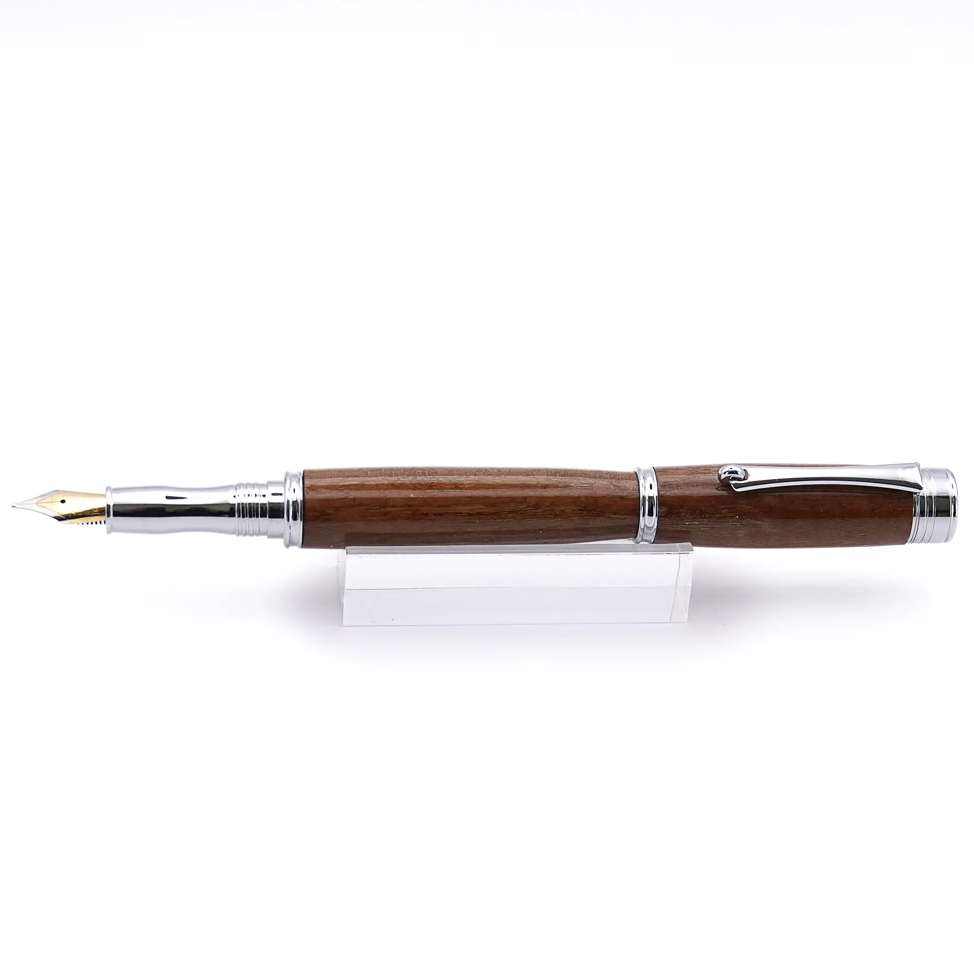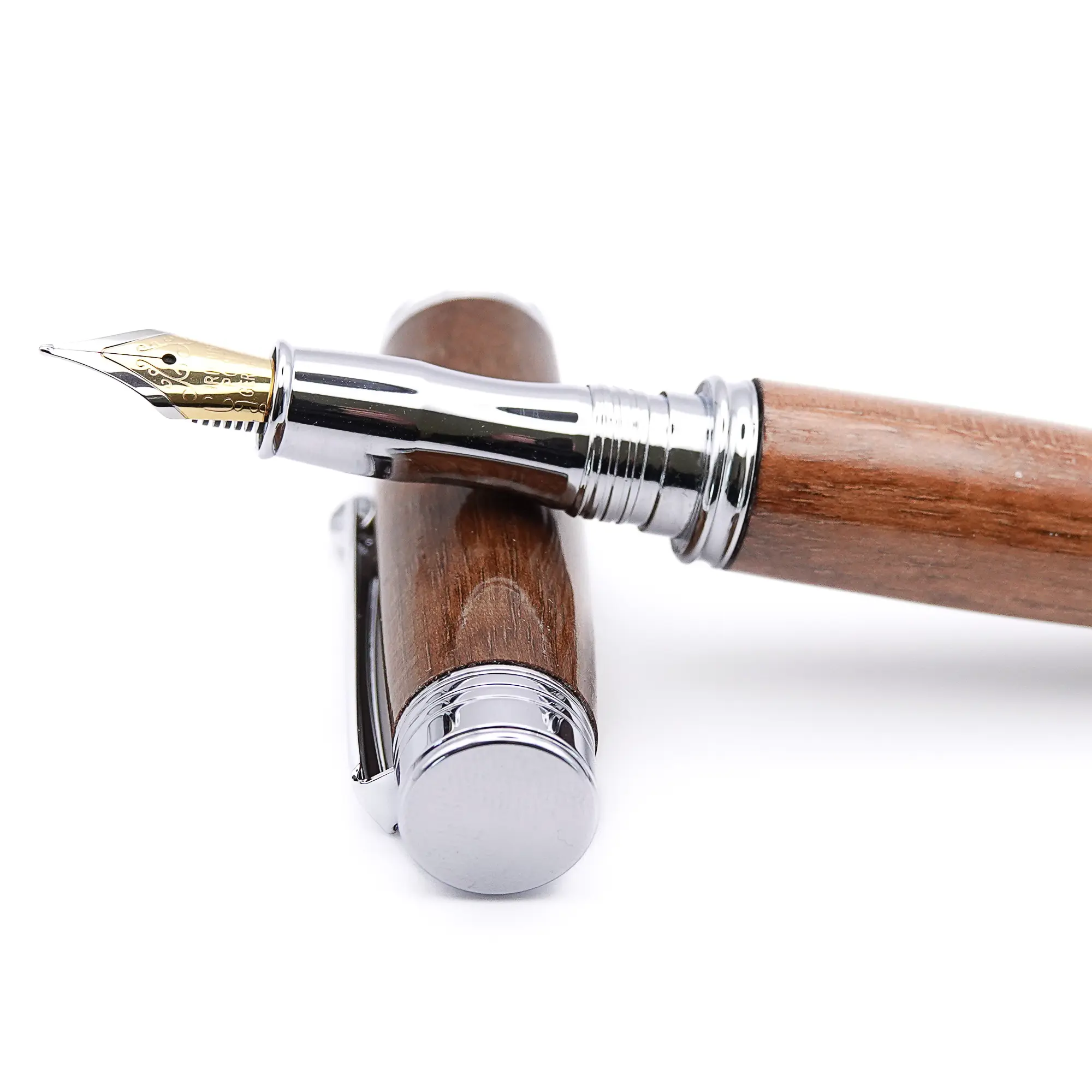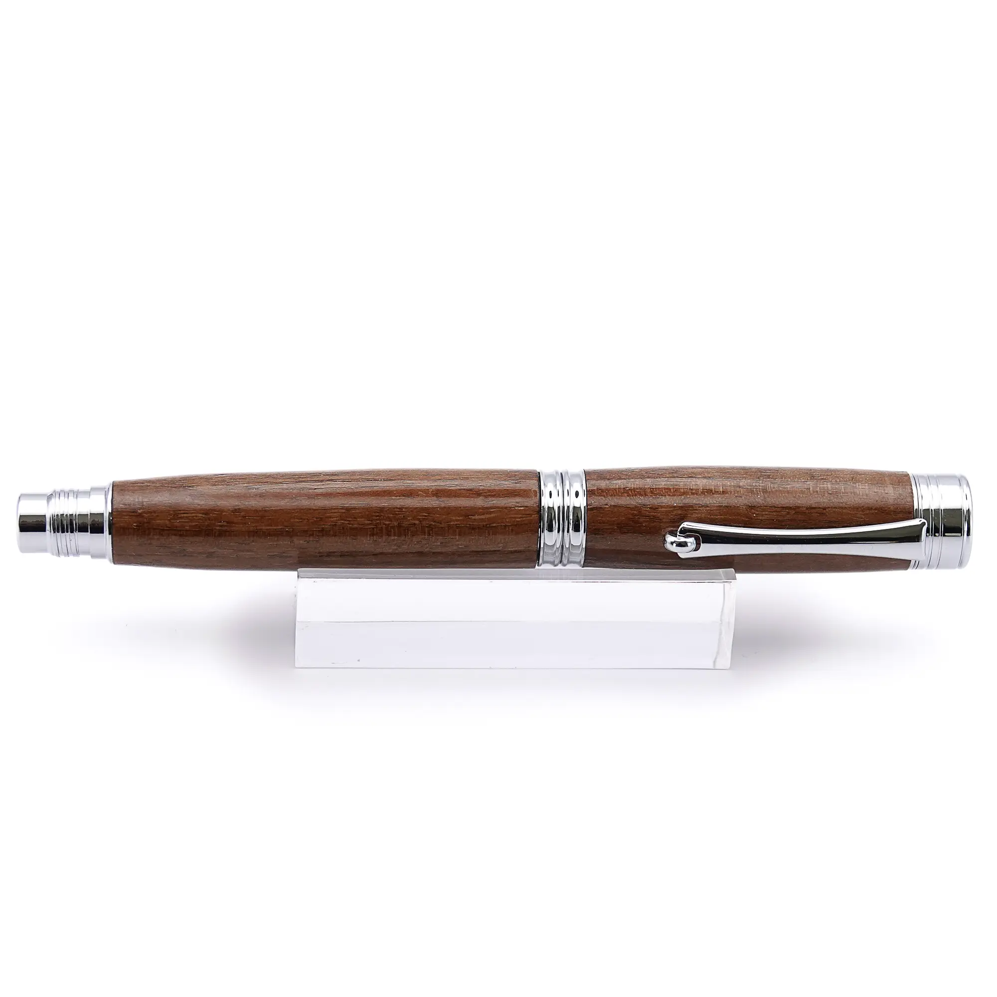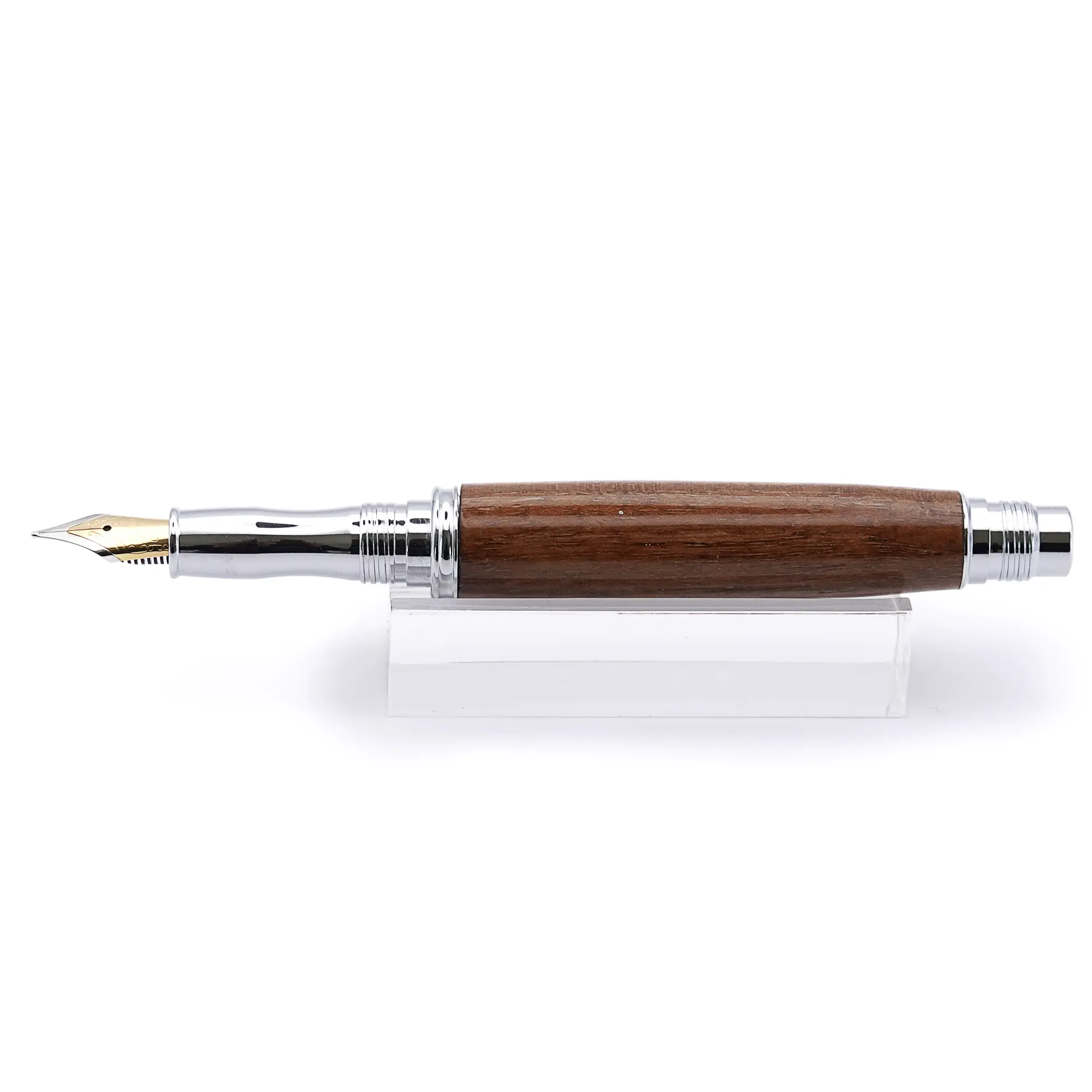 This handmade fountain pen is constructed from a recycled piece of Walnut with Chrome Plated Fittings. The pen is “pillared” so that the cap can be screwed on the back of the pen to extend it for anyone who likes to use a longer pen. The nib has an iridium point.