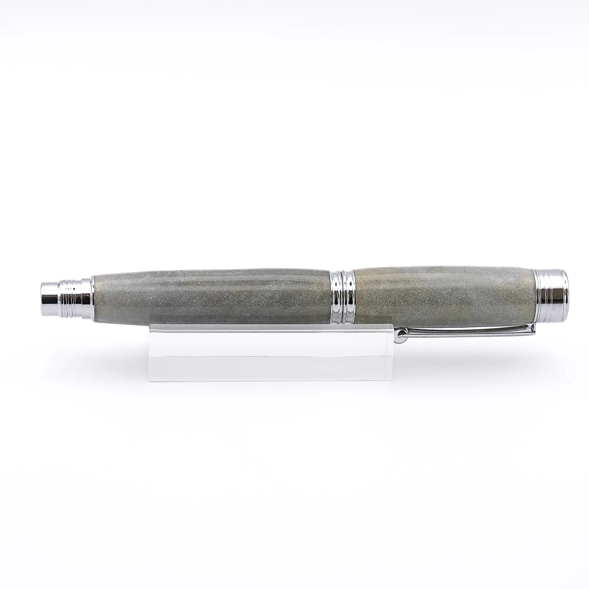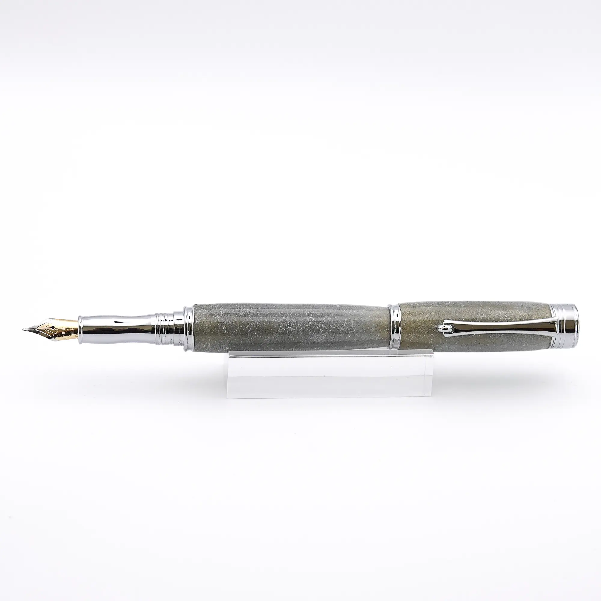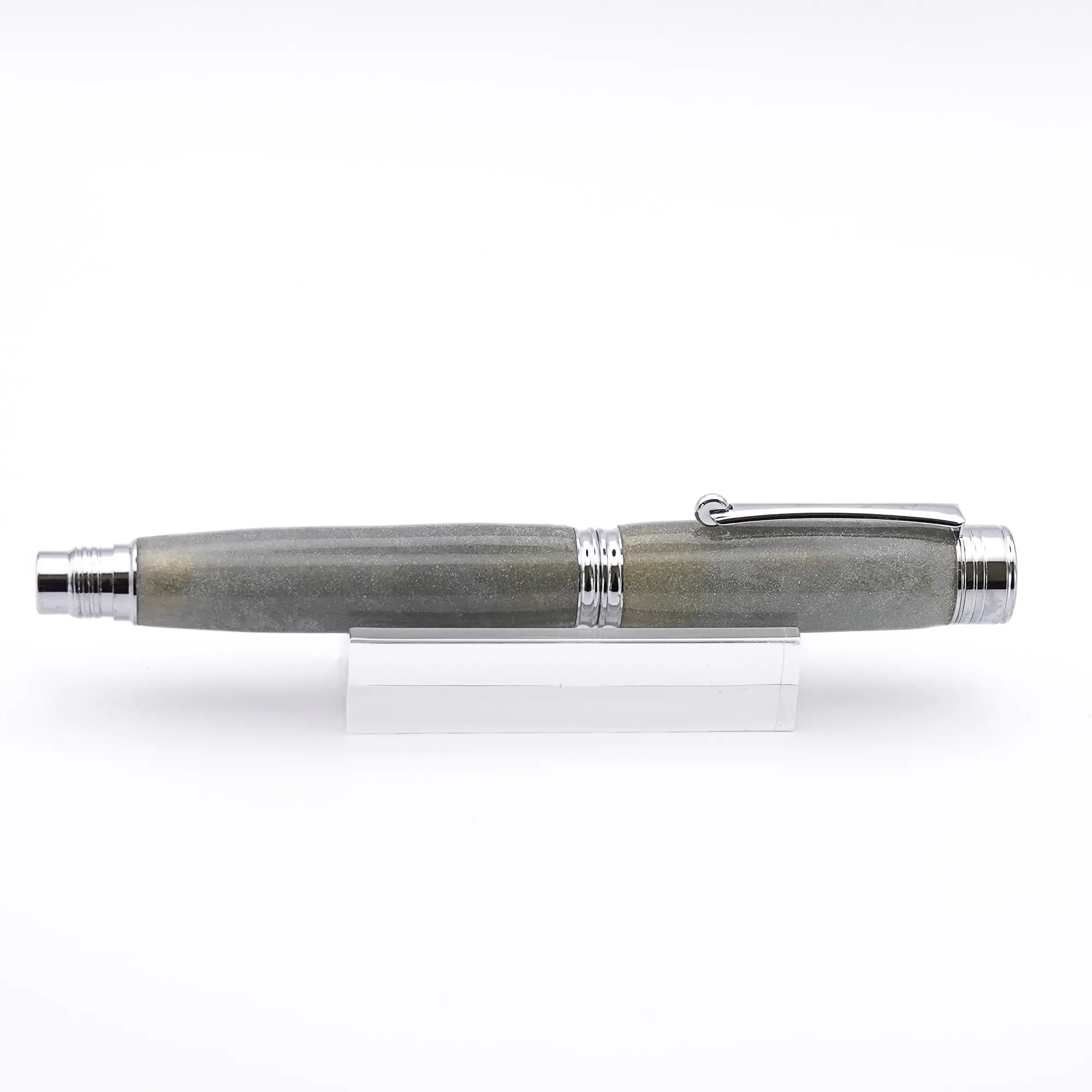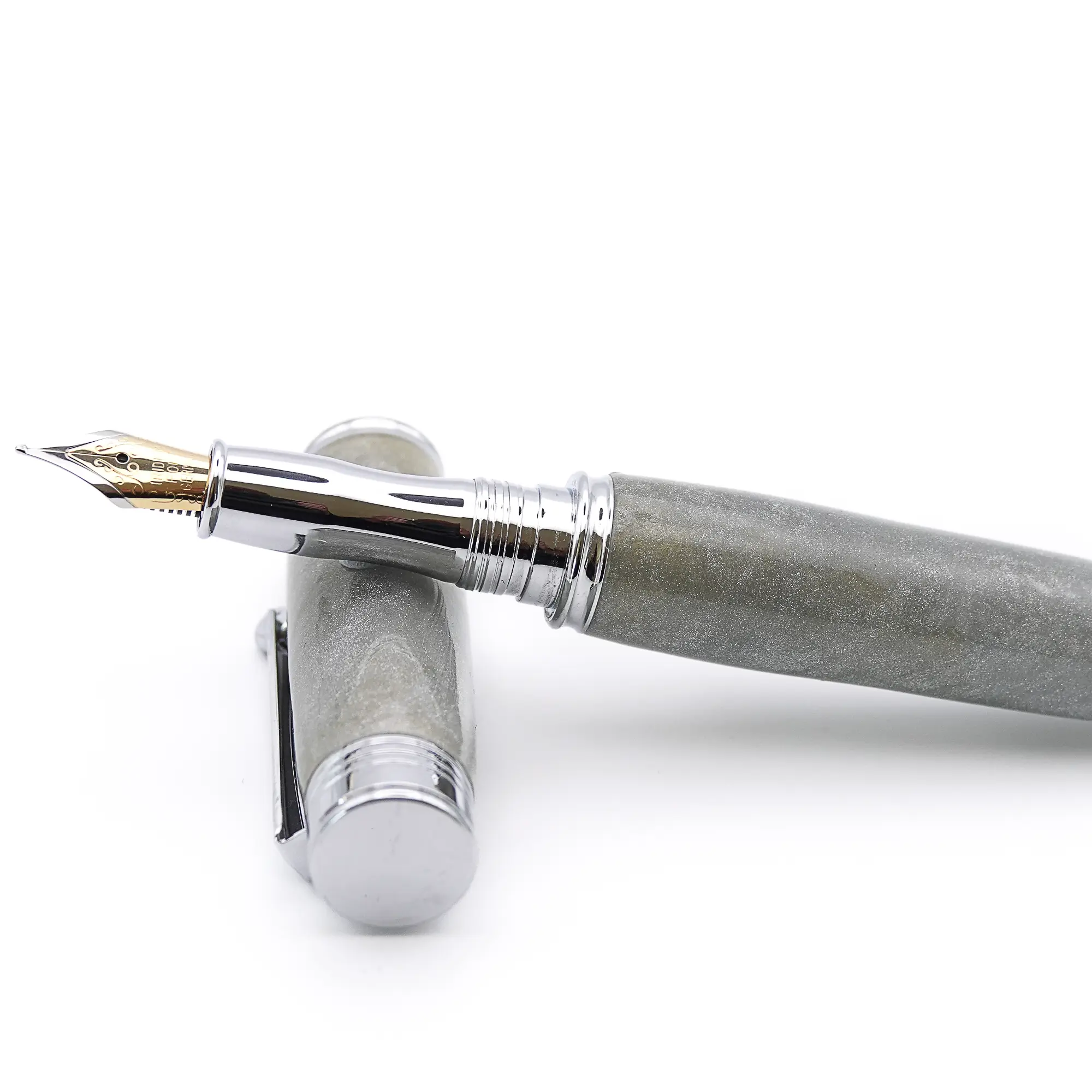 A lovely Fountain Pen in Silver Grey with just a hint of gold resin giving a subtle marbled effect that, along with the Chrome Plated Fittings, compliments this pen nicely. It is nicely balanced and enjoyable to use.
