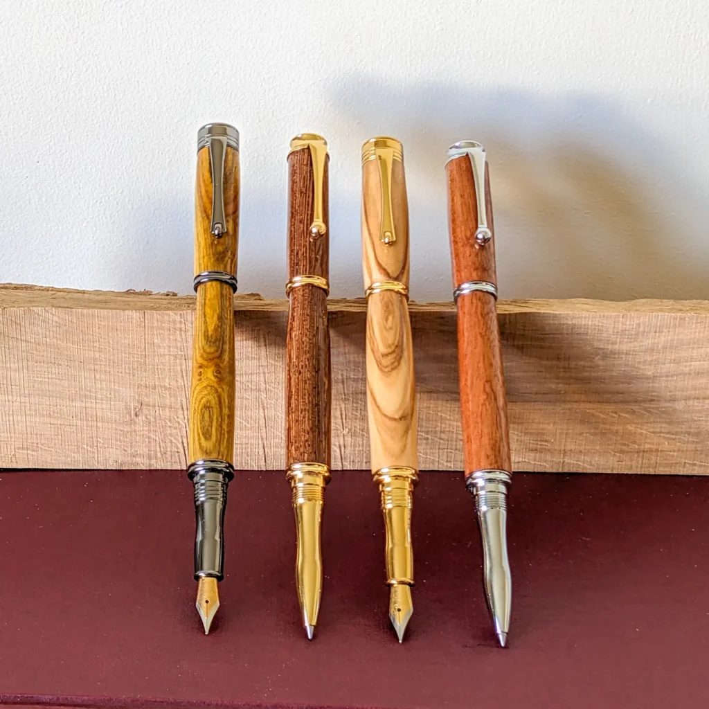 Each bespoke fountain or Rollerball pen is unique and constructed from recycled, reclaimed or sustainable timber and comes with a ink cartridge and ink converter. The pen comes in a velvet Pouch (or a Velvet Pen Hard Case at extra cost).