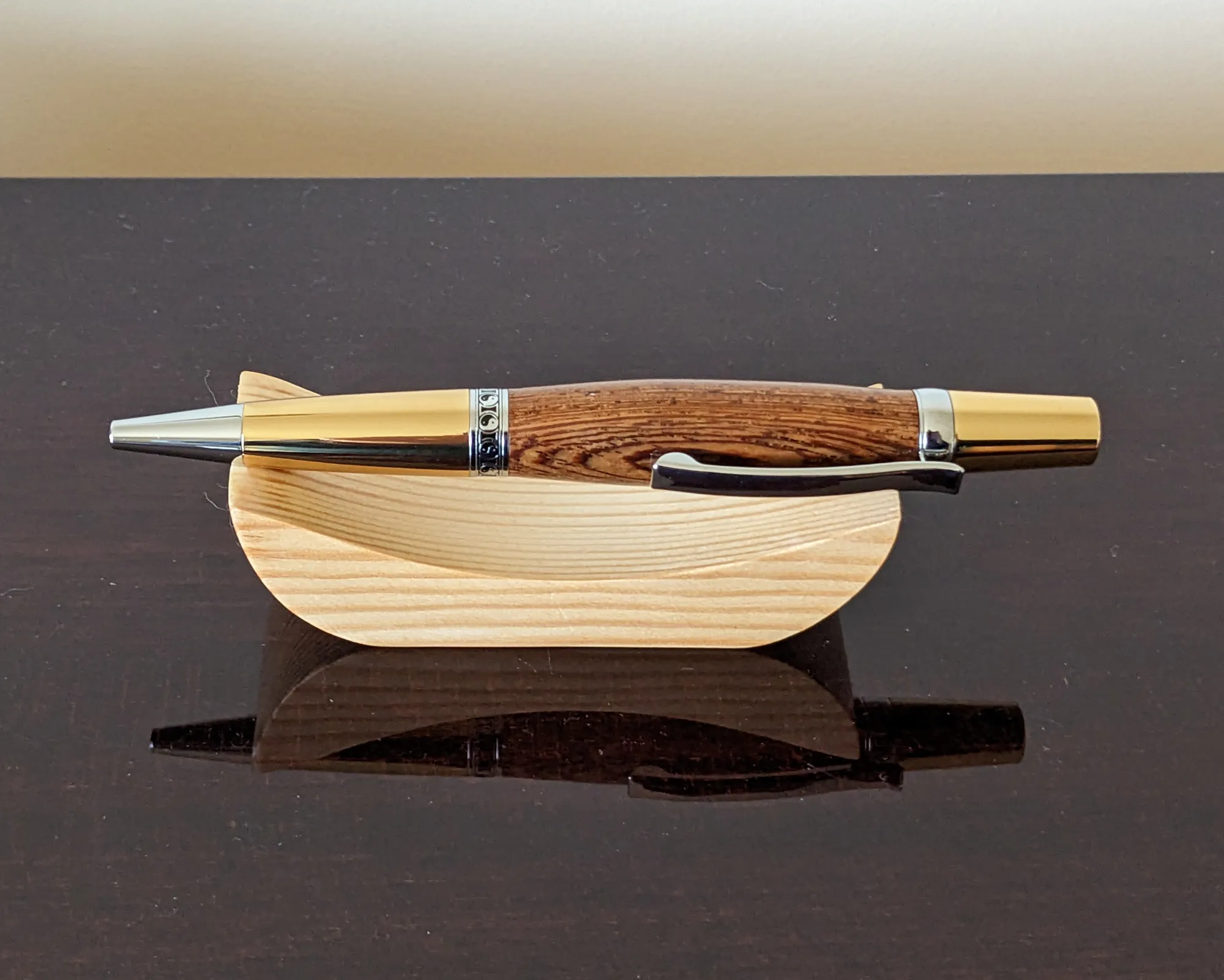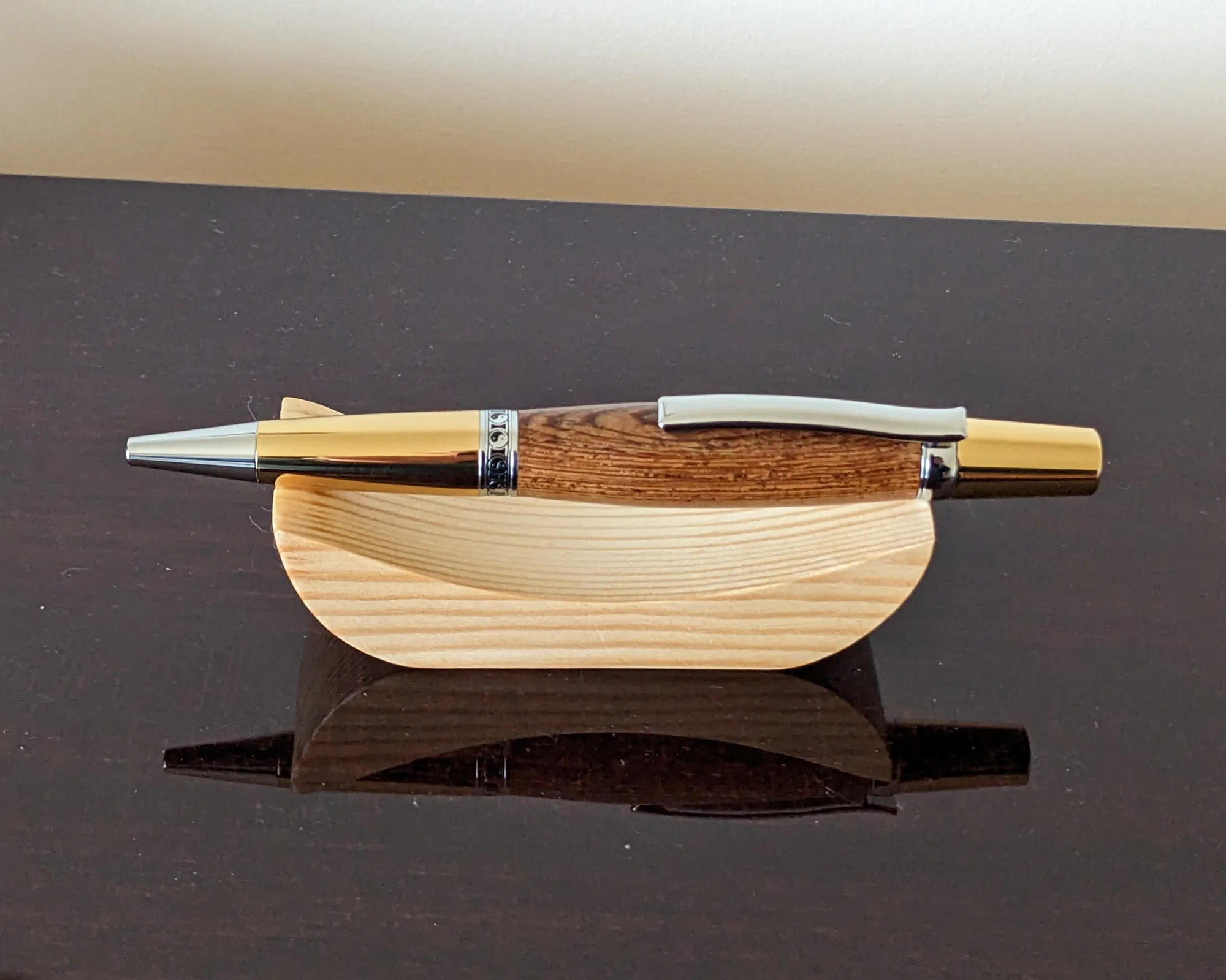 Hand Made Panga Panga Ballpoint Pen with Chrome and Gold Plated Fittings and Yin Yang Separator Ring